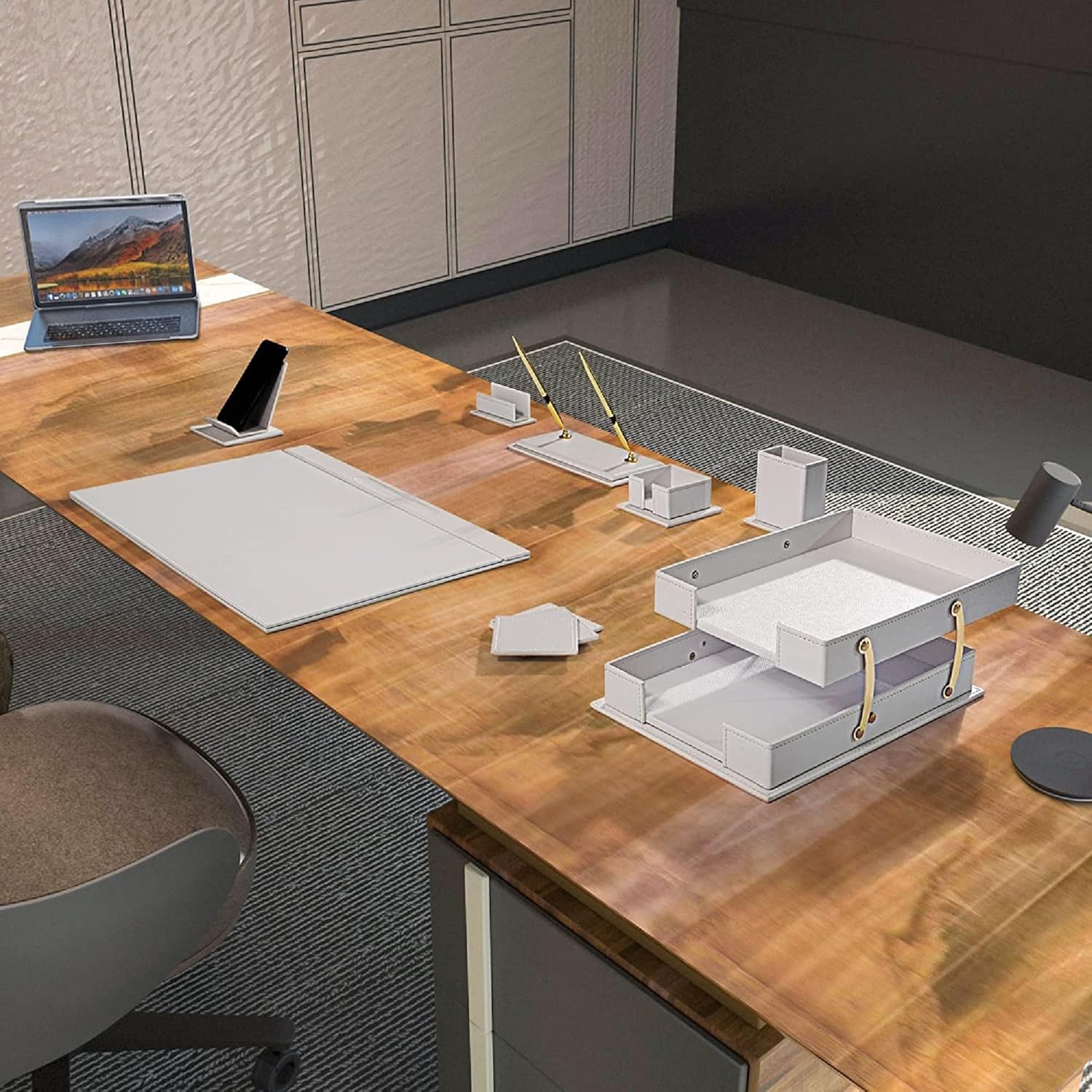 - We are offering you the opportunity to find the office accessories that you need, conceived by our finest leather artisans. Made with authentic leather and in a unique palette of colors, you will definitely add a distinct touch of class to your office décor. Our leather office sets are also well coveted among professionals who use them in conference or meeting rooms.