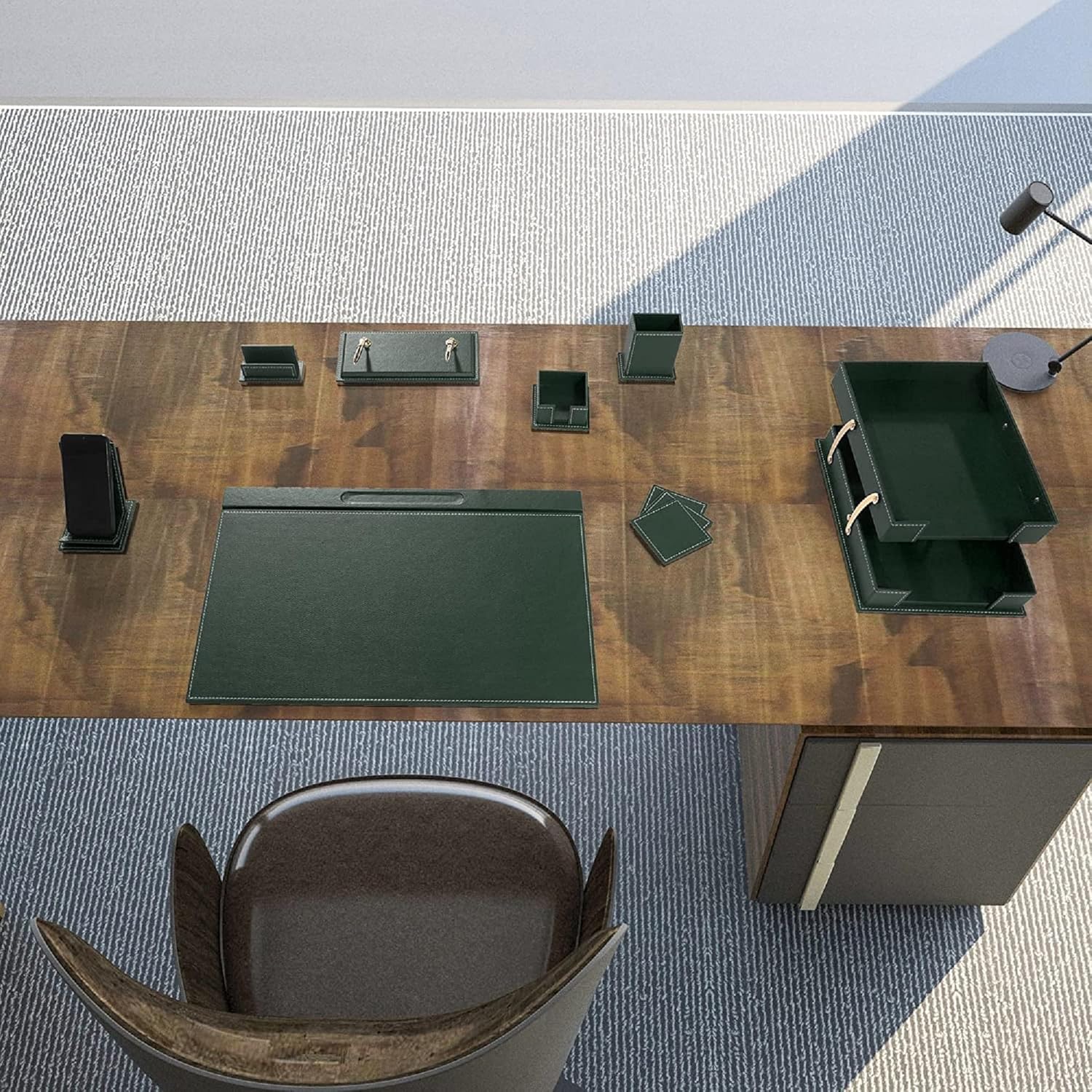 - We are offering you the opportunity to find the office accessories that you need, conceived by our finest leather artisans. Made with authentic leather and in a unique palette of colors, you will definitely add a distinct touch of class to your office décor. Our leather office sets are also well coveted among professionals who use them in conference or meeting rooms.