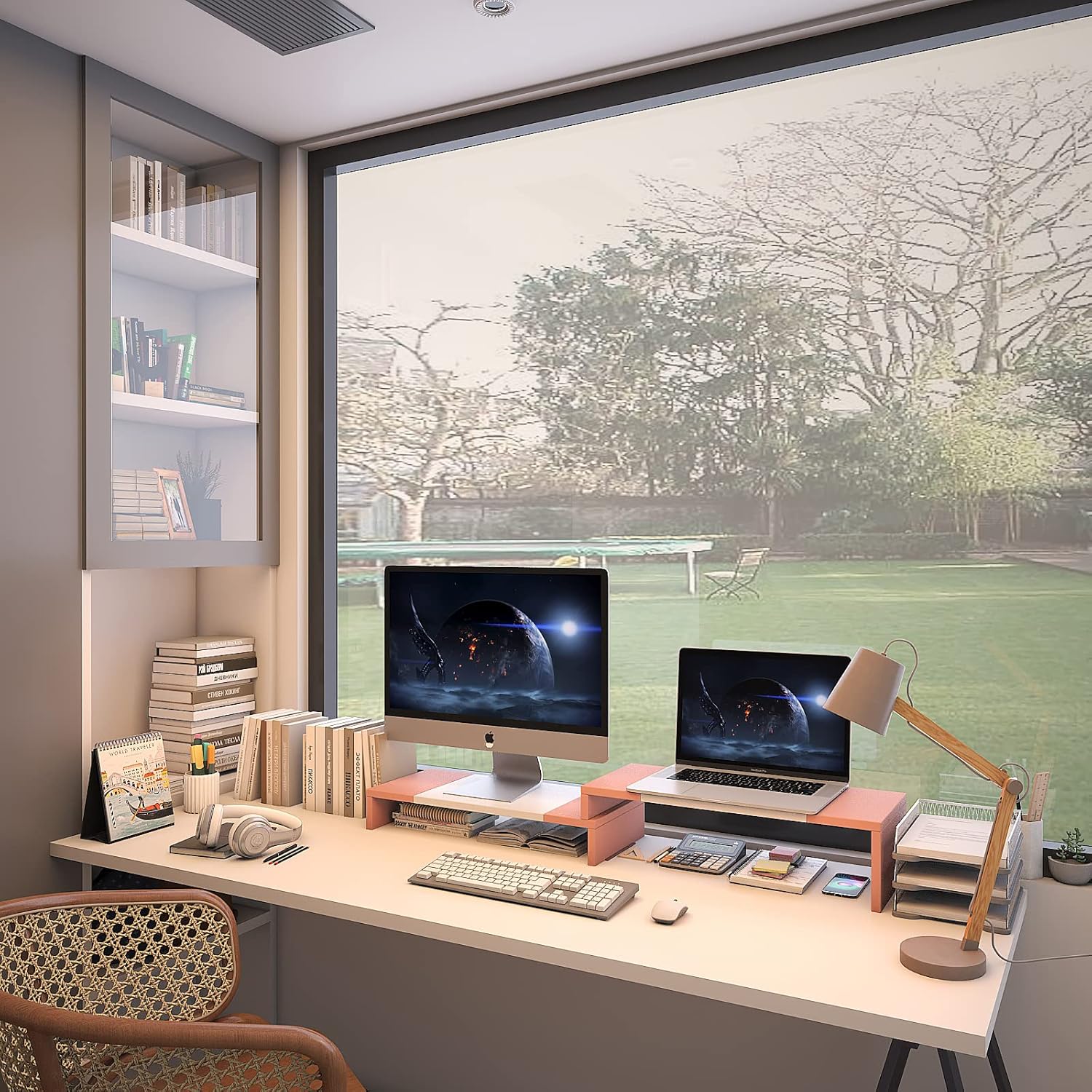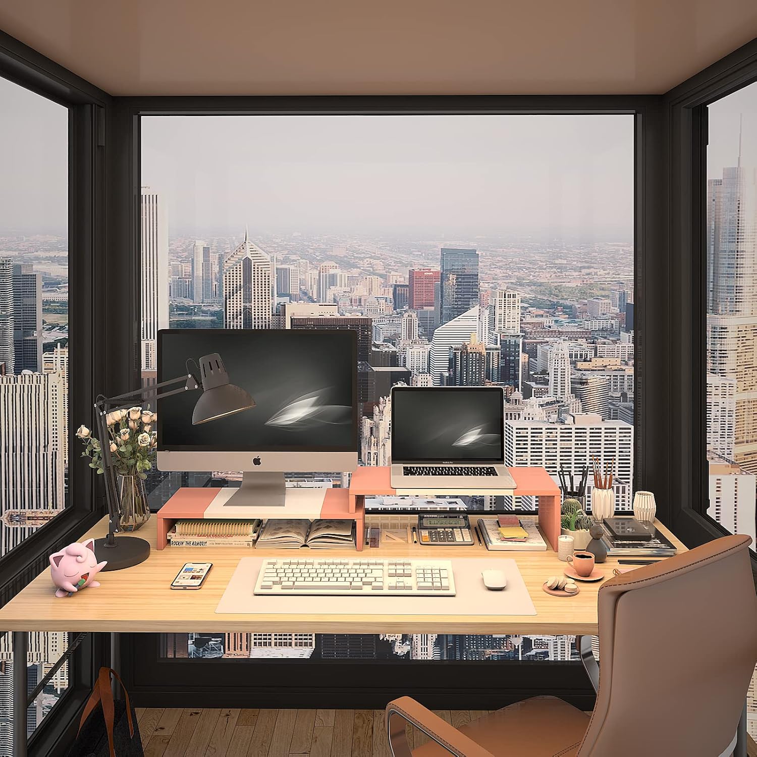 - Dual Monitor Riser :Freely adjust length and angle,the length of computer stand can be adjusted from 18.9 inch to 38.4inch,It can be used at both L desk and regular tables. The adjustable height and Angle gives you a comfortable office experience.