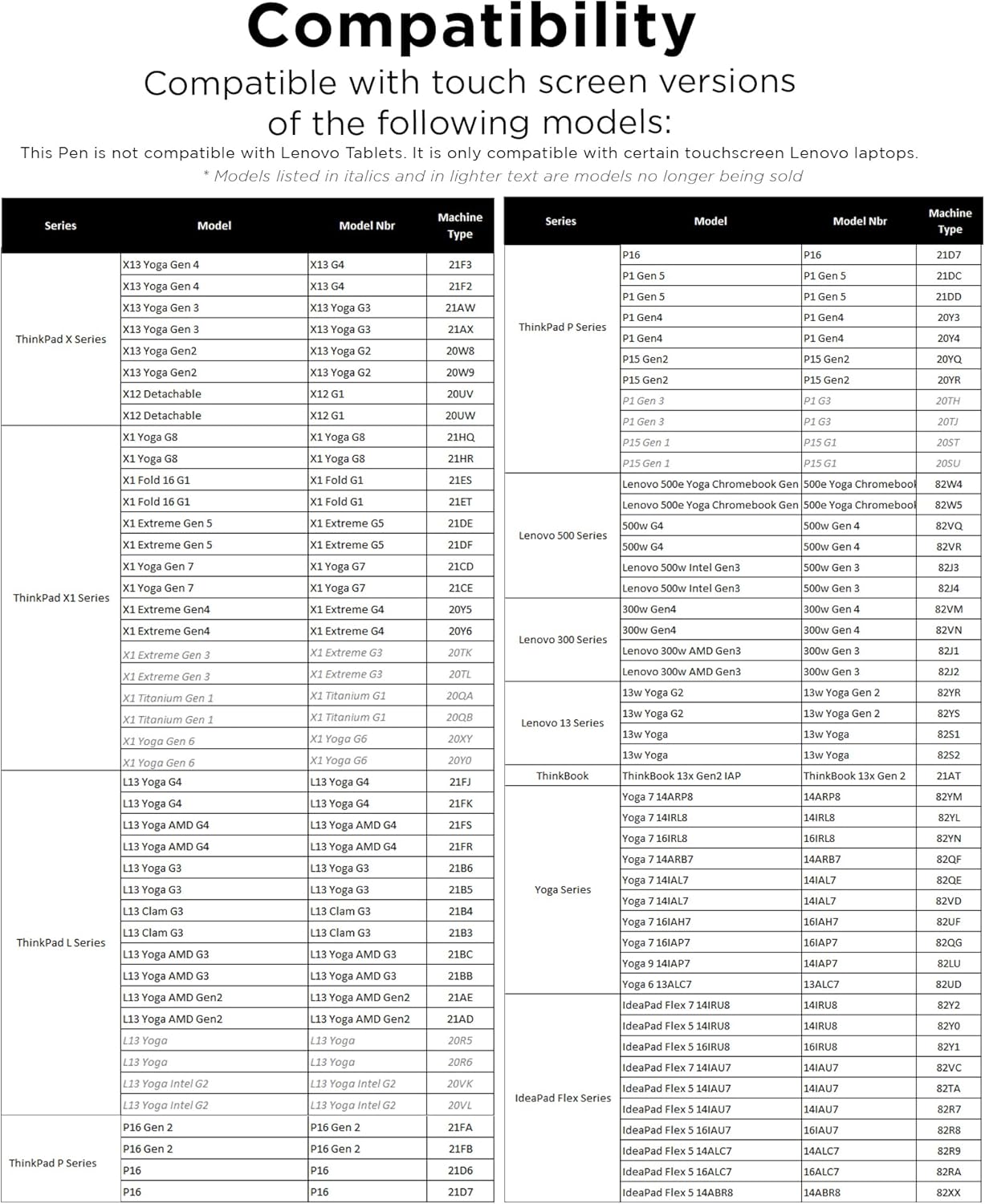 - Works with Touch Screen versions of the following models: IdeaPad Flex 5 14ALC7-82R9, IdeaPad Flex 5 14IAU7-82R7 , IdeaPad Flex 5, IdeaPad Flex 5 16ALC7-82RA, IdeaPad Flex 5 16IAU7-82R8, Yoga 6 13ALC7-82UD, Yoga 7 14ARB7-82QF, Yoga 7 14IAL7-82QE, Yoga 7 14IAL7-82VD, Yoga 7 16IAH7-82UF, Yoga 7 16IAP7-82QG, Yoga 9 14IAP7-82LU, ThinkBook 13x G2 IAP-21AT