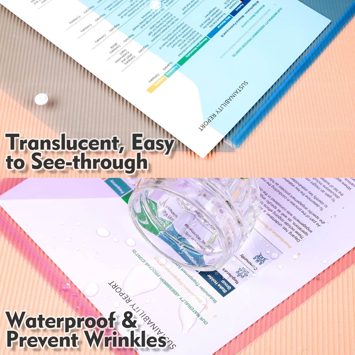 - Multipurpose Plastic Folders: 24pcs File bags for school use, to hold papers, handouts, notes, stationery etc., for office use, to keep brief report, project document, finance statement, meeting material etc., for home use, to store bills, receipts, appliance instructions, photos etc., for craft items, craft papers, stickers, embellishments, for storing travelling items, makeup items and so on.