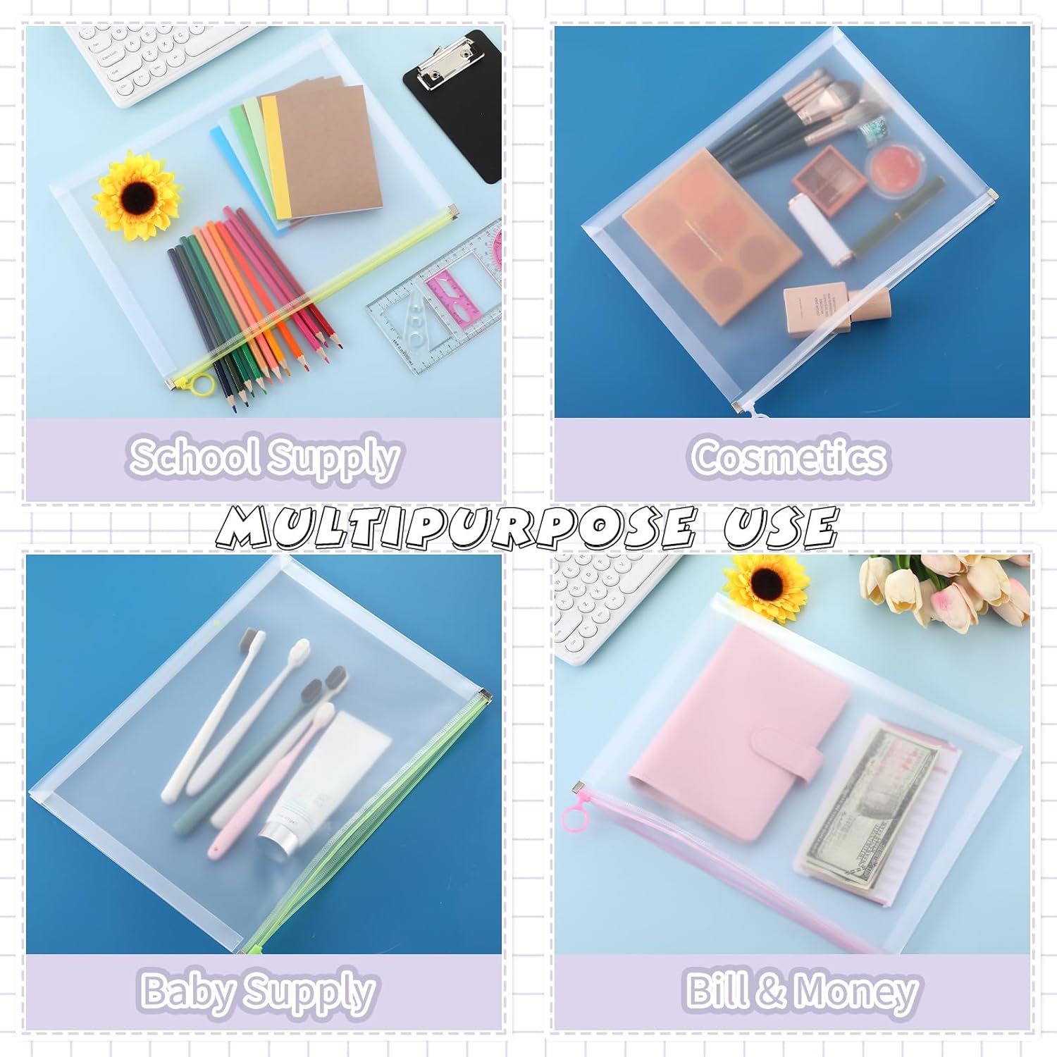 - Quality PP Material: plastic envelopes with zipper are made of quality PP material, sturdy, tear resistant and waterproof, keeping clean, sealed with quality zip, lightweight and long lasting, and the easy slide zipper keeps your file paper safe, 7 colors zipper for easy assortments