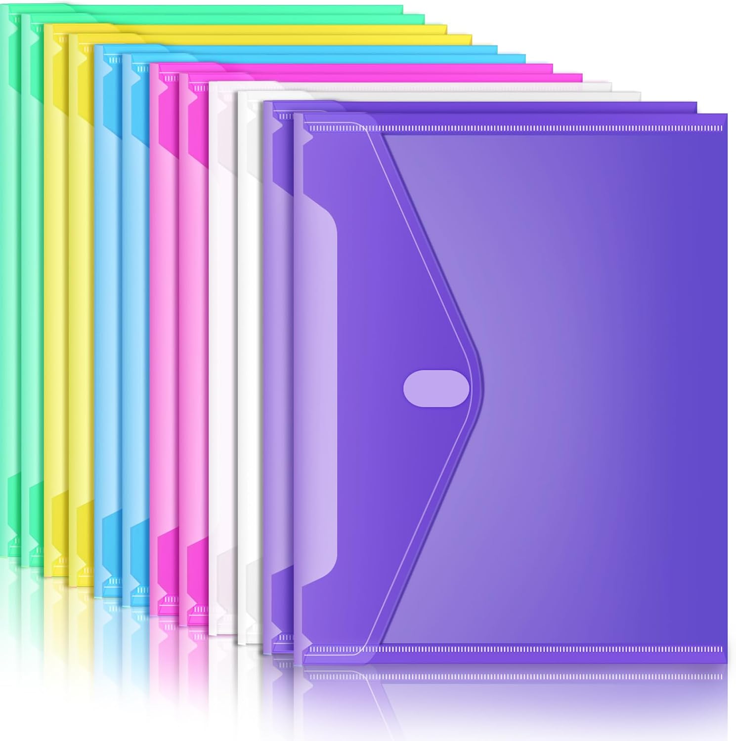 - Colorful Transparent Envelopes & Large Capacity: 6 assorted colors: blue, green, yellow, purple, pink and clear (each color with 2). It's easy to organize and distinguish your paper with a different color. The envelope folder size is 13.25 x 9.25 inches, suitable for A4/US letter size files & other small items, holds no less than 200 sheets of paper.