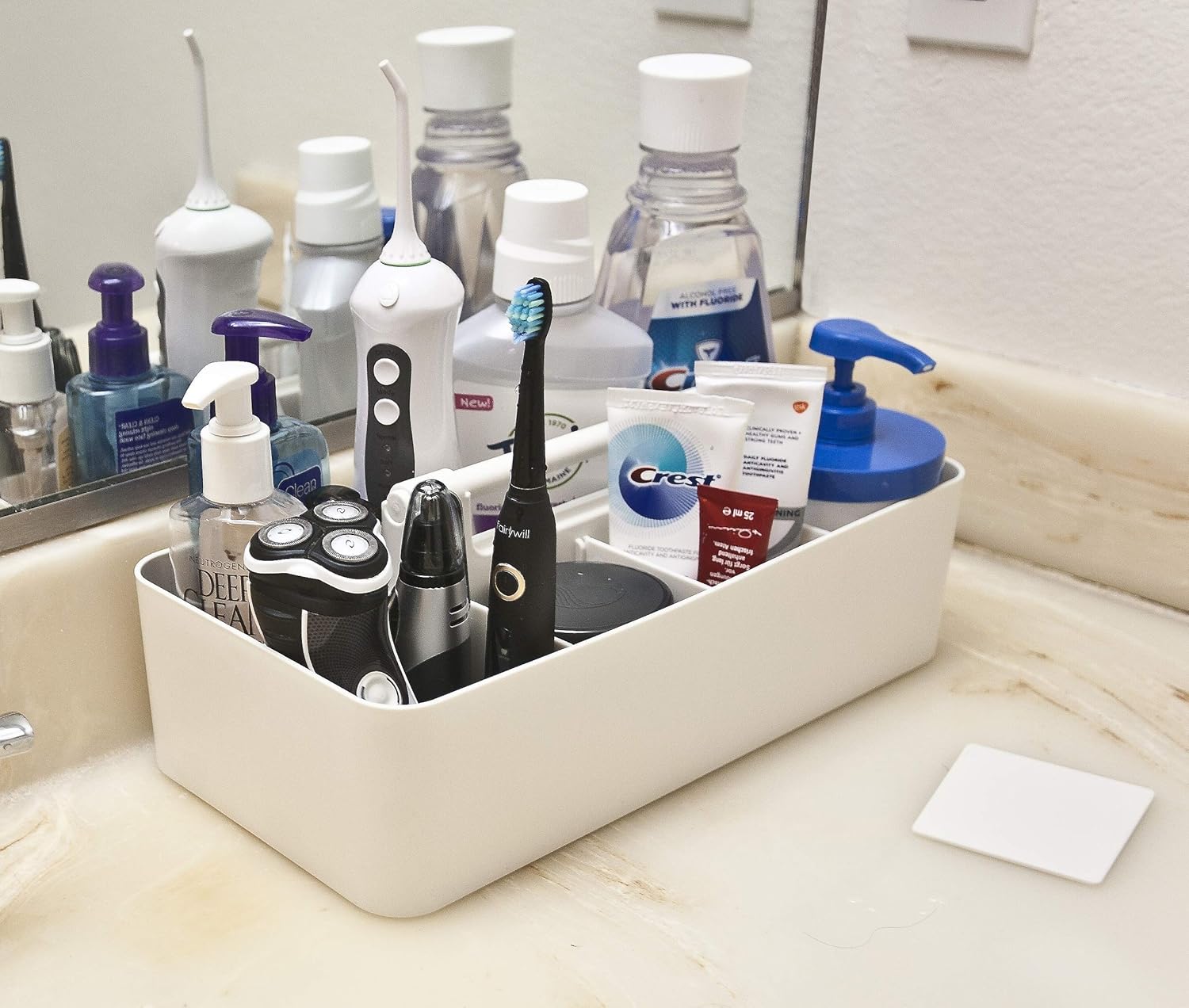 - PORTABLE: Feature easy-carry round smooth handle to make it simple to transport goods from shelf to cabinet or desktop; Just grab and go; The perfect storage and organizing solution for modern living spaces; Open tops and divided compartments make it easy to see what is inside and quickly grab what you need; Use these convenient storage bins to keep office desk items all in one place; Great for children's crafting items and school supplies too; Perfect for home or commercial workspace
