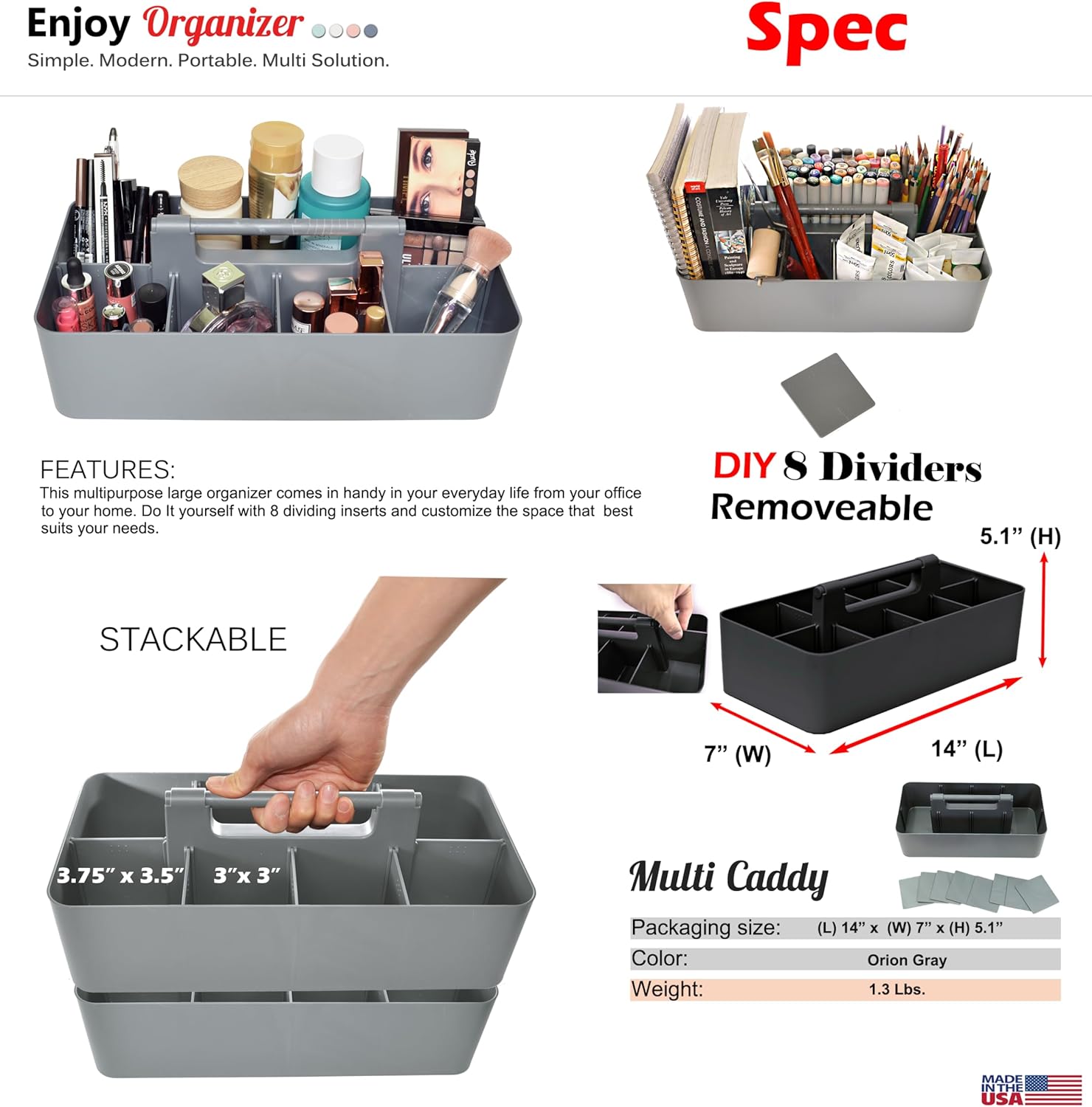 -Large Portable Caddy, DIY Dividers, 8 Compartments, School Office Supplies Home Business Organizer,Portable Basket with Handle Storage Made in USA (6 PACK, Orion Gray)
