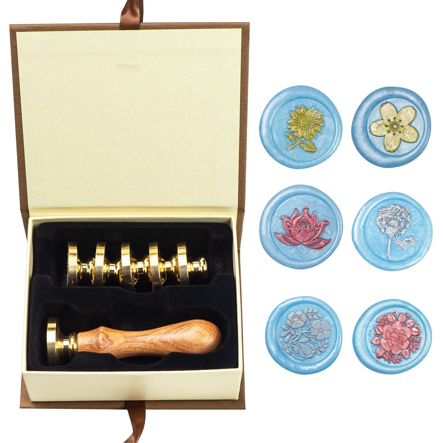 - [Package Includes] ANBOSE wax seal stamp kit includes 1 PCS Wooden handle,1 PCS Sunflower wax seal stamp, 1 PCS Three Flowers wax seal stamp, 1 PCS Lotus wax seal stamp, 1 PCS Dandelion clover wax seal stamp, 1PCS Cherry Blossoms wax seal stamp,1 PCS Starlight Rose wax seal stamp and 1 Gift box.