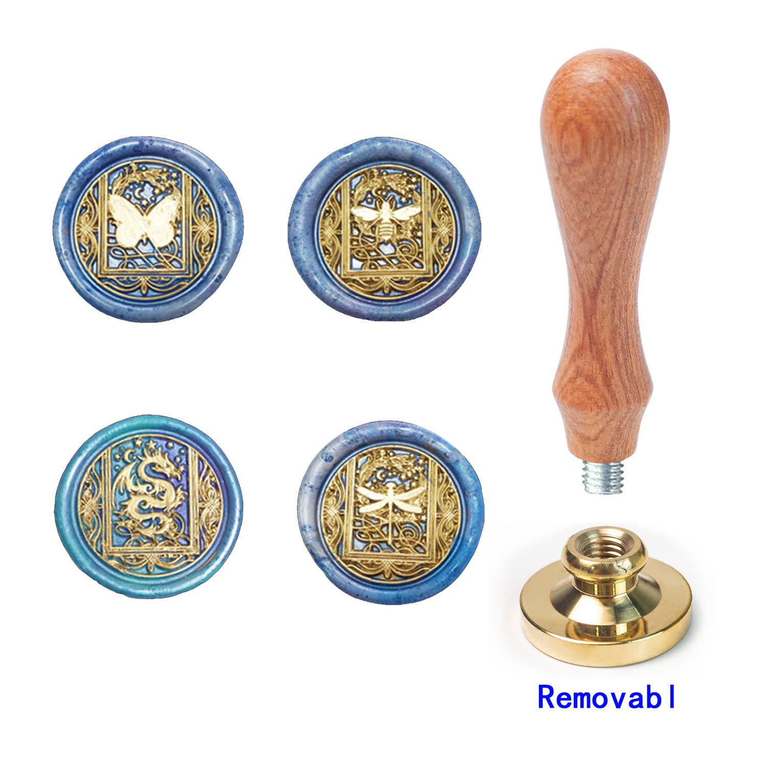 - [Package Includes] ANBOSE wax seal stamp kit includes 1 PCS Wooden handle,1 PCS Starry Butterfly wax seal stamp, 1 PCS Starry Dragonfly wax seal stamp, 1 PCS Starry Bee wax seal stamp, 1 PCS Starry Dragon wax seal stamp and 1 Gift box.