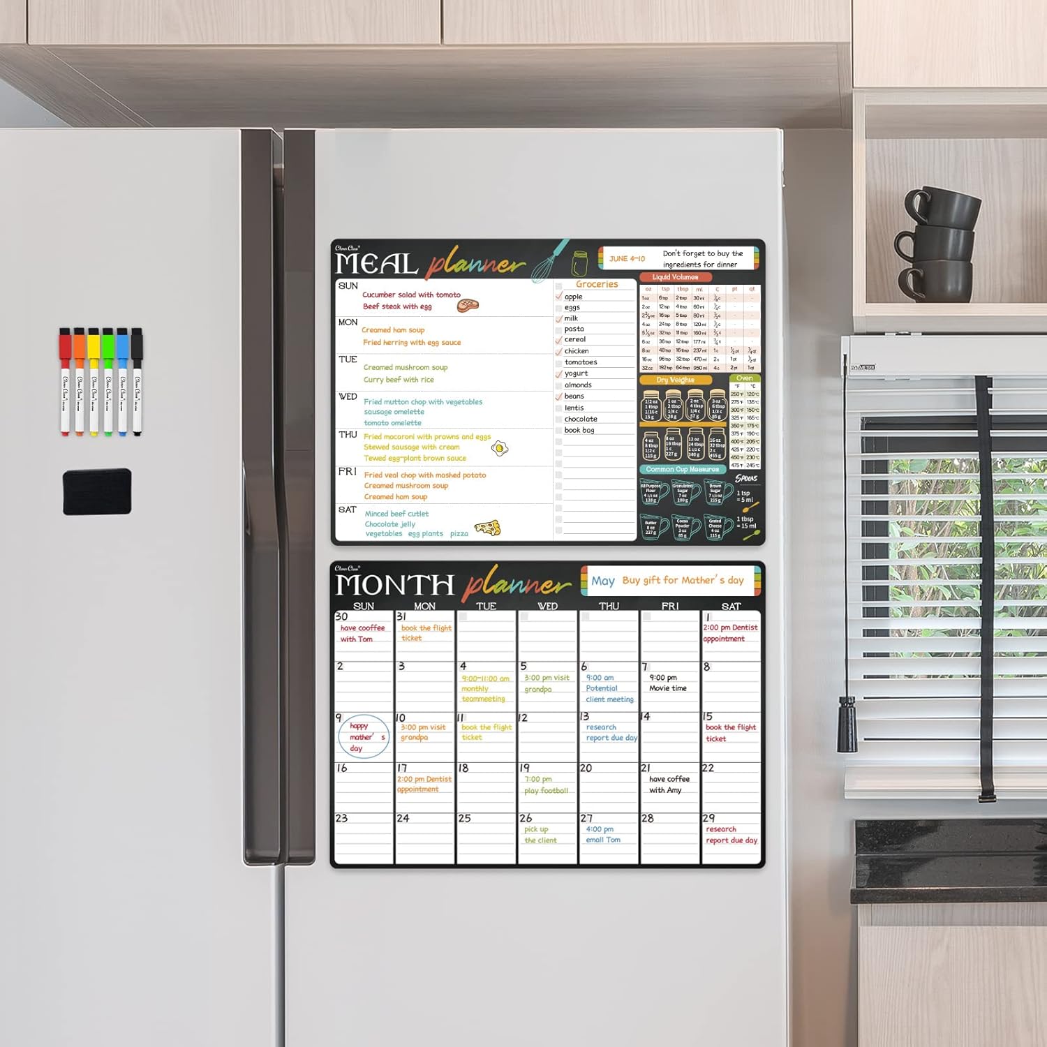 - Multifunctional menu board - This set also include a meal planner board. It contains a cooking conversion chart and a list section. You can plan your meal through a whole week.