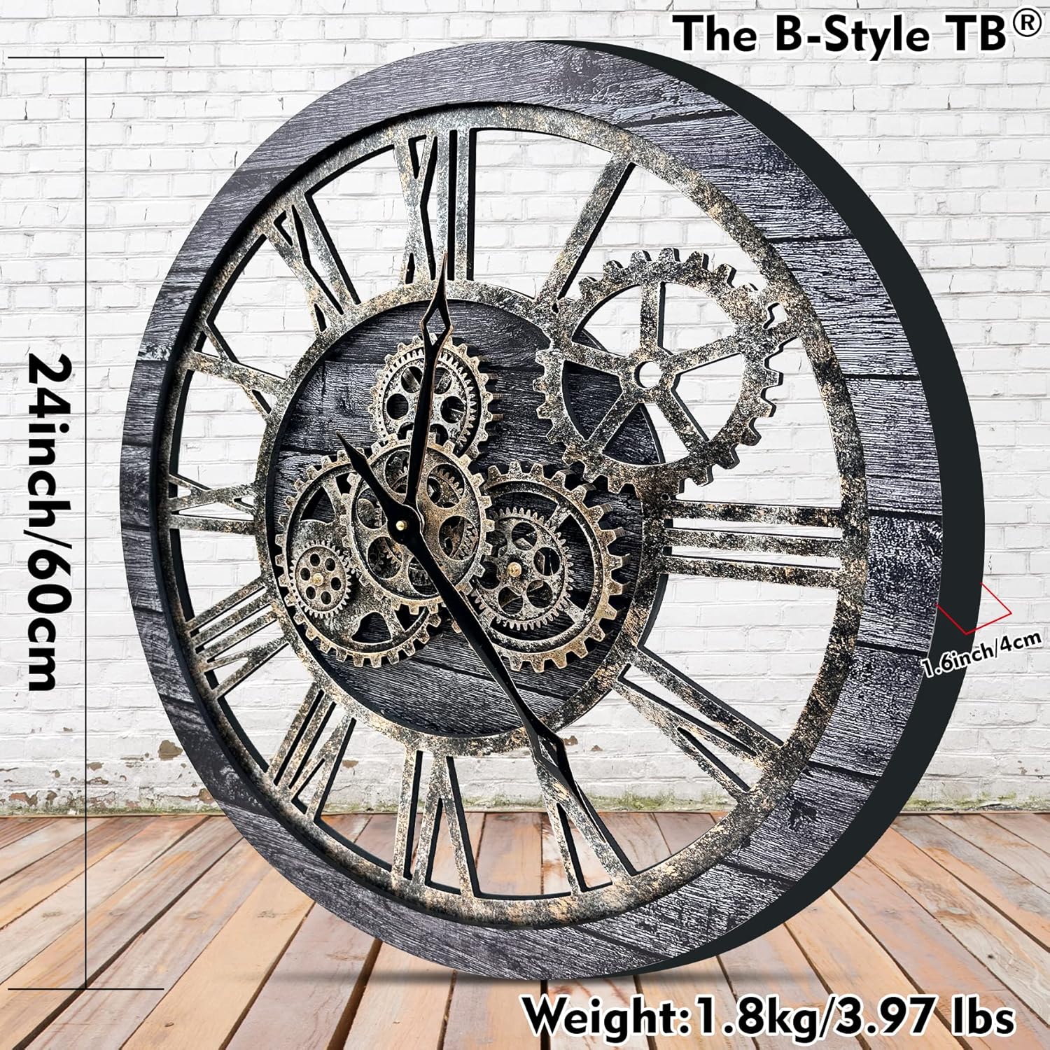 The B-Style Large Wall Clock 24 inch Moving Gear Wall Clock Oversized Vintage Farmhouse Wall Clocks for Living Room Decor Decorative Rustic Industrial Wood Clock (Carbon Gray)