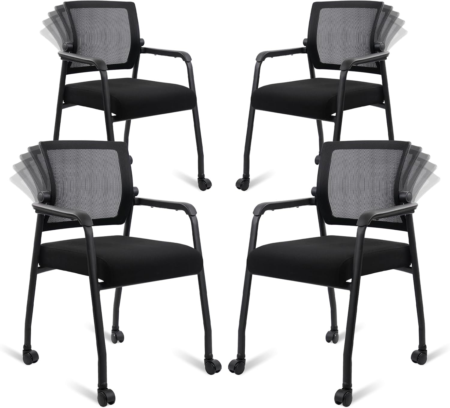 Waiting Room Chairs with Wheels, Adjustable Mesh Backrest, Desk Chair with Ergonomic Lumbar Support and Thickened Seats Cushion, 4 Pack Black