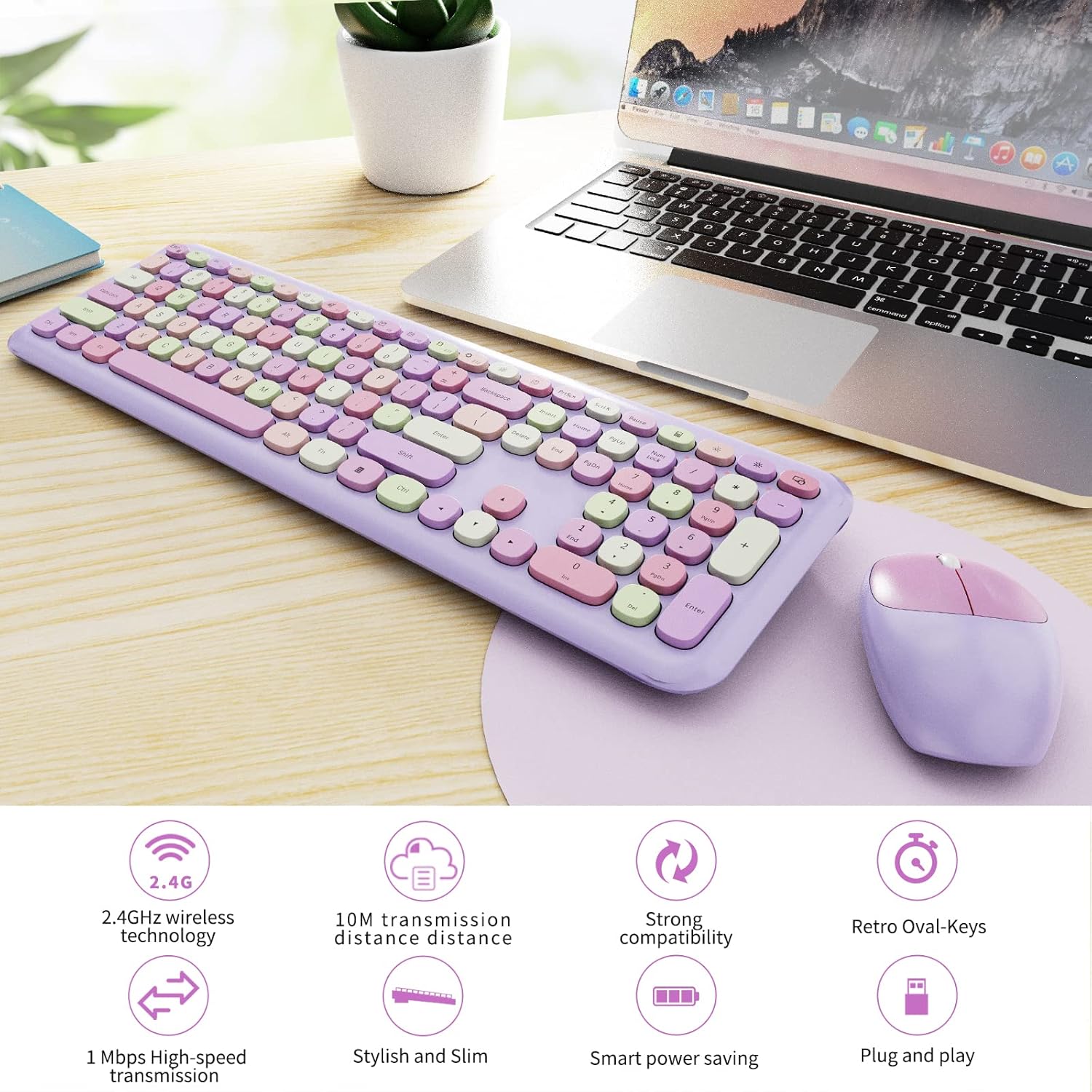 Wireless Keyboard and Mouse Combo, Colorful Ergonomic Full Size Retro Low-Noise Keyboard with Cute keycaps, Compatible with Windows, PC, Perfer for Home and Office Keyboards (Purple)