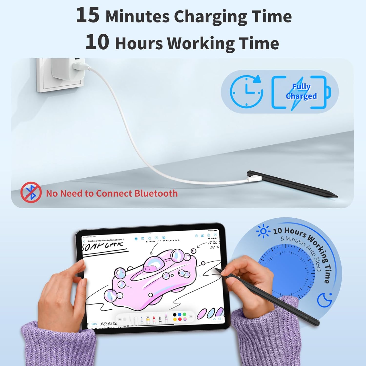 - ✅Fast Charging and Long Standby: This stylus pen support 10 hours of continuous use and 180 days long term standby for only 15 Minutes per charging. Don’t need to turn off it by hand, it will auto-fall asleep after idle for 5 minutes to save power