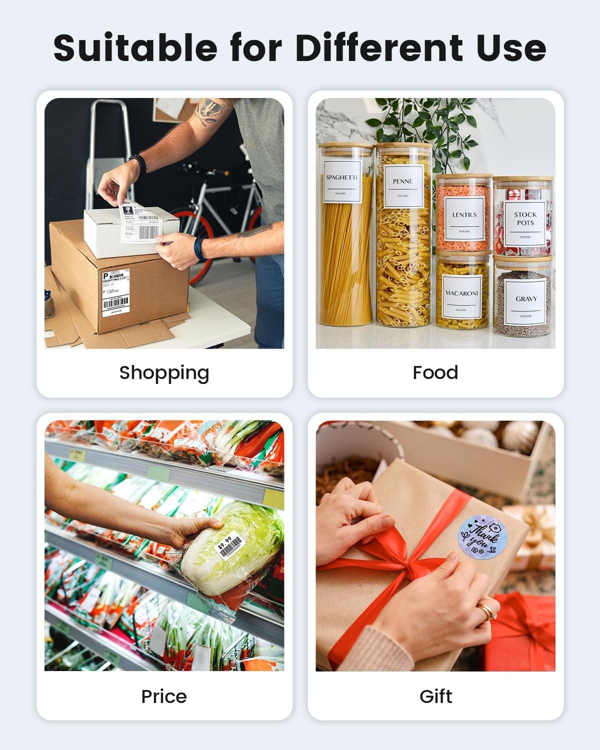 - [Various Platforms Compatibility] - This shipping label printer can support the width of 1 - 4.6 inches labels, which is widely used to print labels from major sales and shipping platforms, such as eBay, Shopify, Amazon, Etsy, Poshmark, UPS, USPS, FedEx, ShipStation, DHL, Shippo. One-click use: text, pictures, barcodes, QR codes, Form, Thanks cards, hundreds of icons, and many pre-made templates for commercial and home use. Improve your efficiency. Also a gift for your friends and family