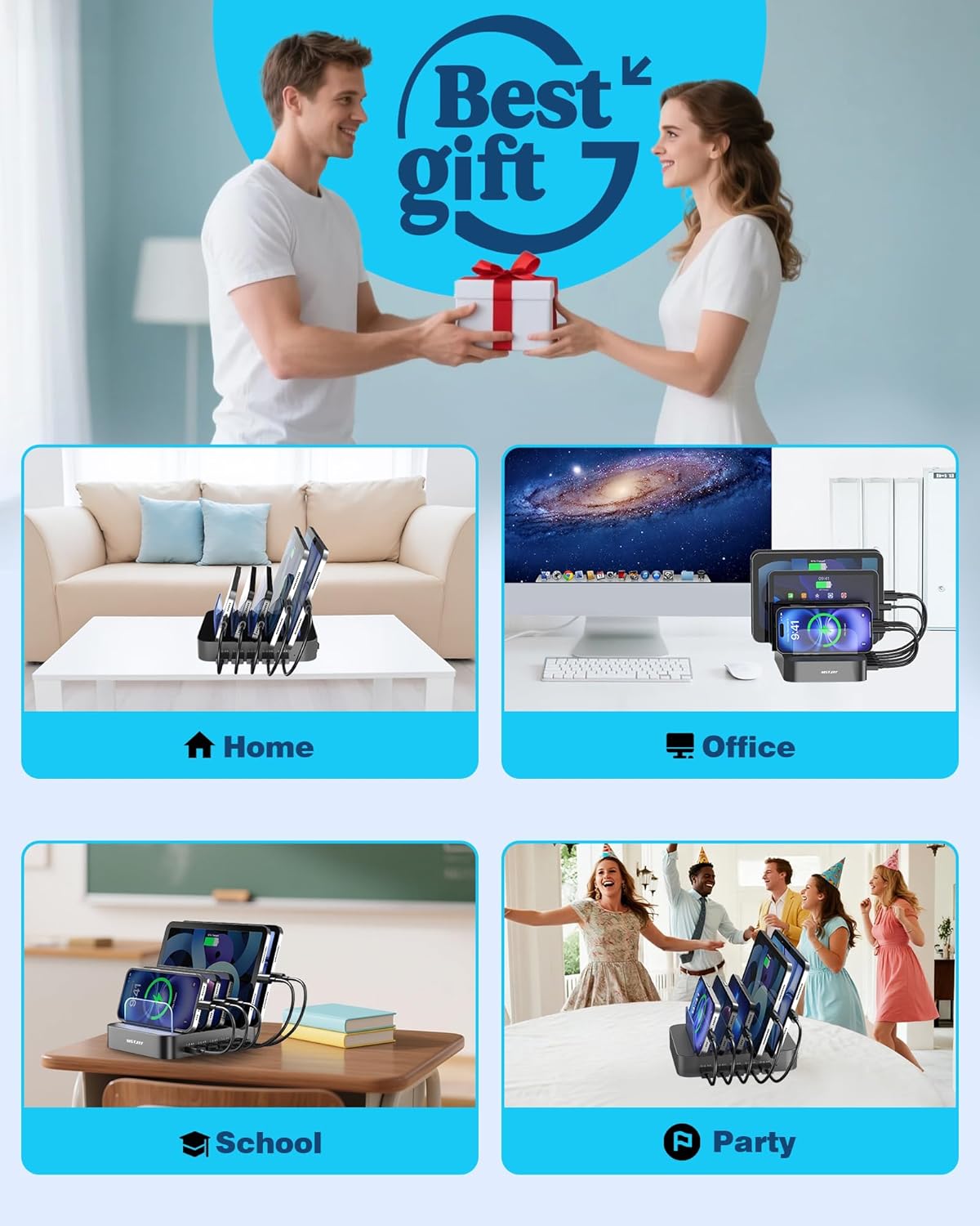 - ăFast and SmartăThis charging station for multiple devices will charge your smartphones, tablets up to 80% than other USB-A charger station with 2.0A or less. Our multiple charging station will automatically detect your devices and adjusts voltage for minimal charging time.