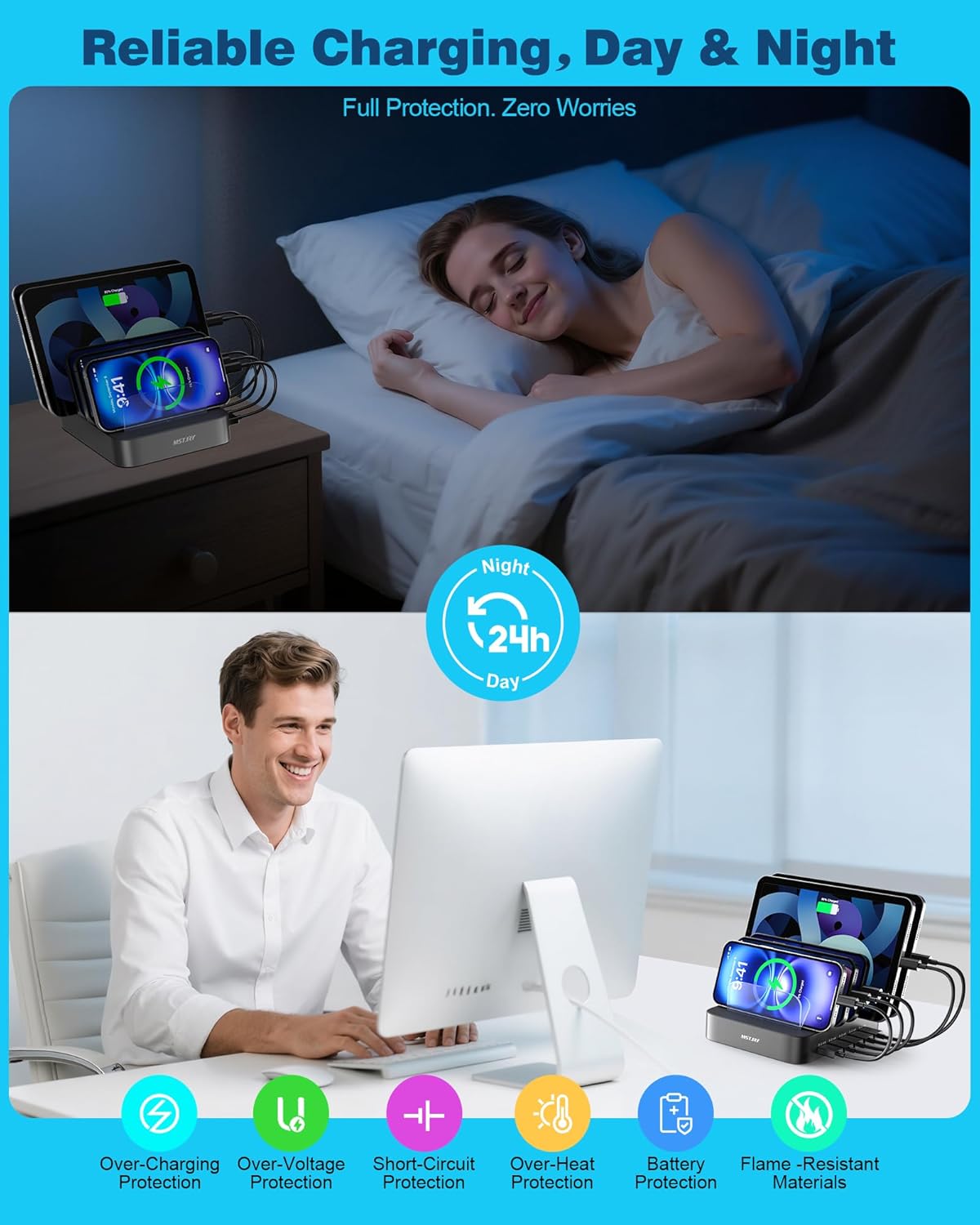 - ăMulti ProtectionăEvery port of the charging stations will offer exactly the charging current required to match your devices needs, keeping your phones safe. The phone charging station features a safety switch giving you a quick visual indication that it is powered on. Removable dividers can hold your large tablets even with thick case.