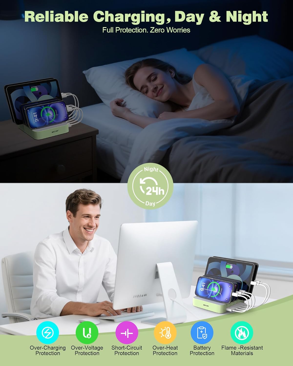 - ăMulti ProtectionăEvery port of the multi charger station will offer exactly the charging current required to match your devices needs, keeping your phones safe. The phone charging station features a safety switch giving you a quick visual indication that it is powered on. Removable dividers can hold your large tablets even with thick case.