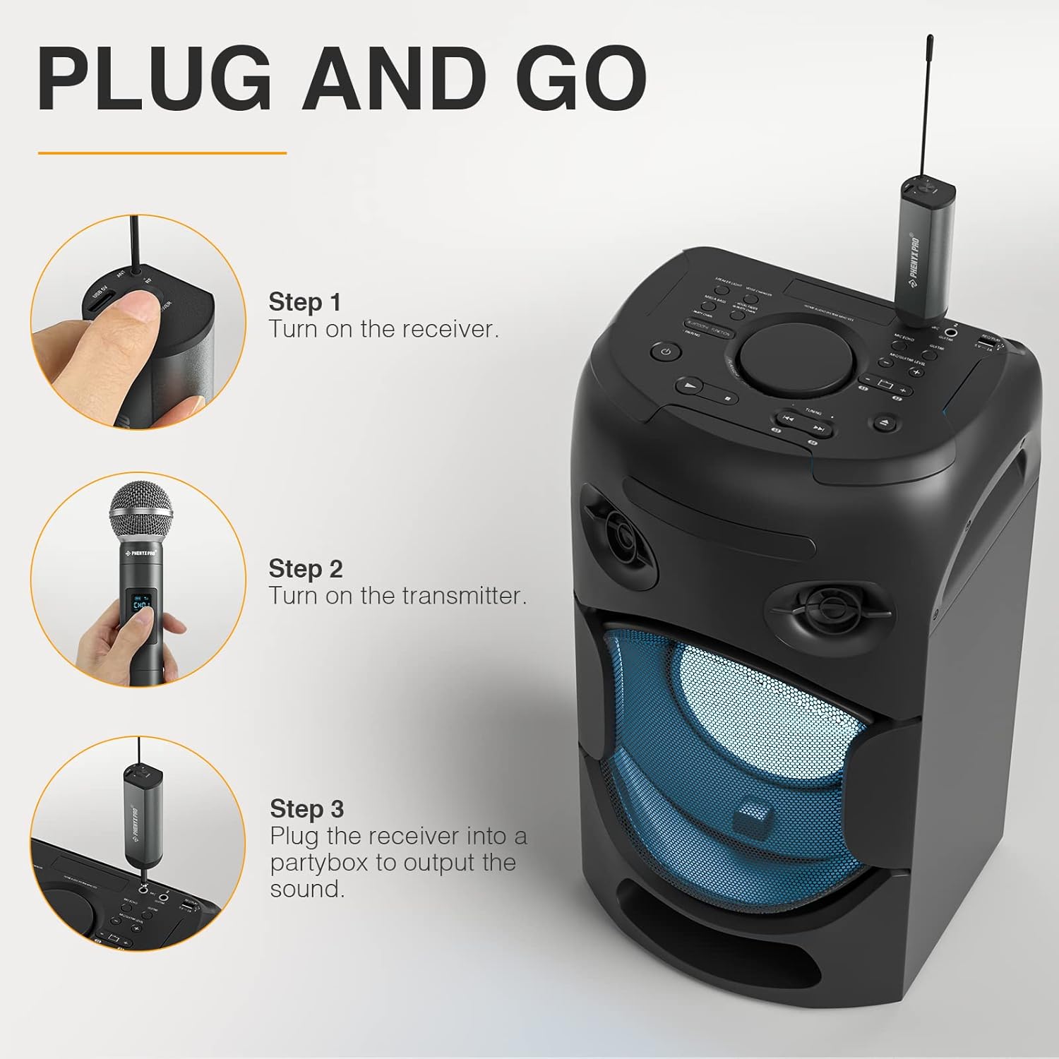 - BUILT FOR LIVE: The dual wireless karaoke microphone for adults with the 48kHz/24Bit UHF digital circuitry transmits encrypted signals to avoid signal crosstalk and deliver accurate sound. 15 UHF tunable frequency groups for the micrófono inalámbrico in 902 - 928MHz fend against crowded spectrum conditions, available for simultaneous multiset hookup. The cardioid dynamic singing microphone delivers delay-free stable performance and noise-free pure sound, suitable for live performance.