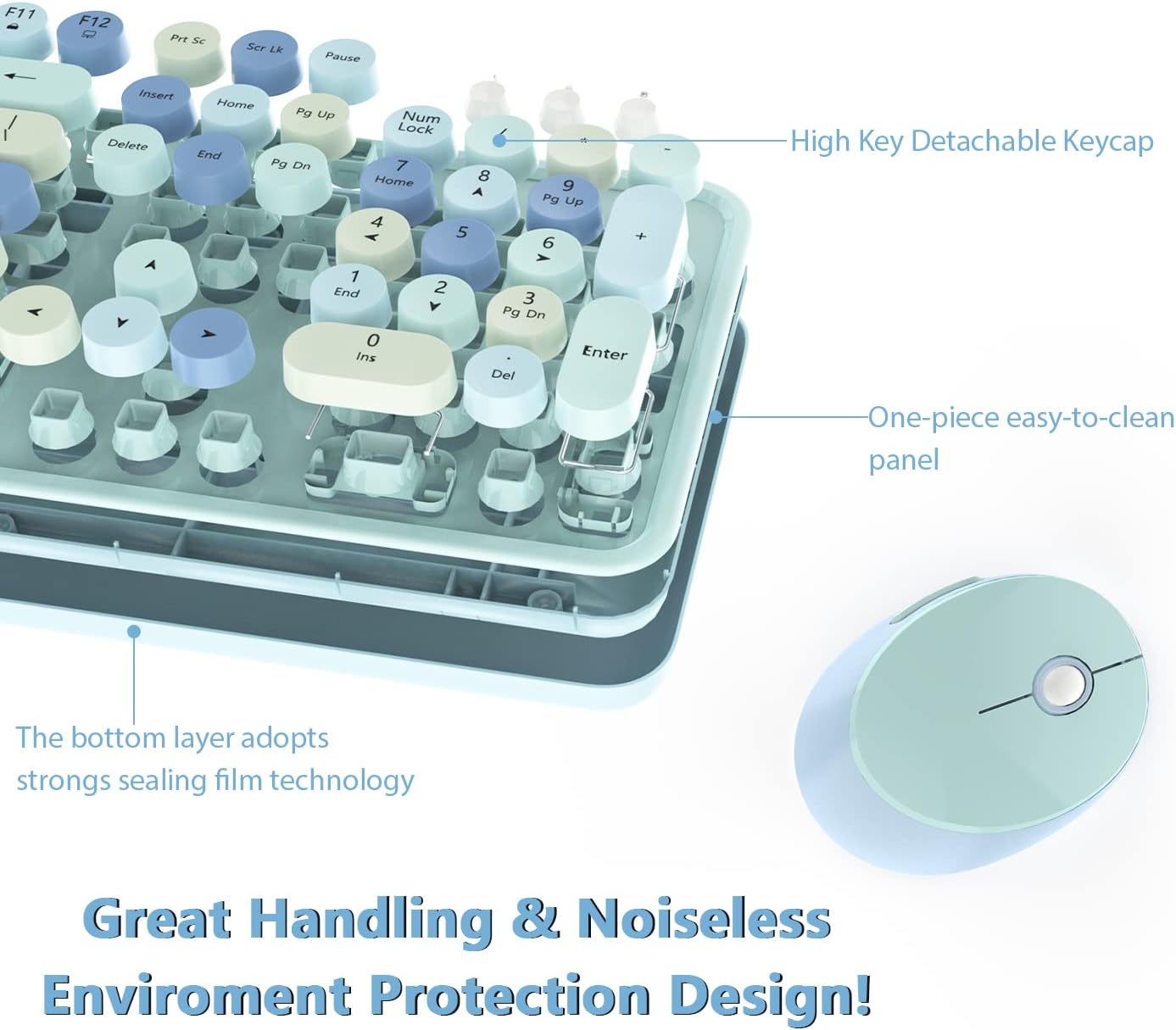 - Retro Round Key Cute color rounded keycaps with scissor-switch design, silent to press and rebound quickly, bring you visual enjoyment and provide comfortable touch of the fingers, enhance the total smooth typing experience
