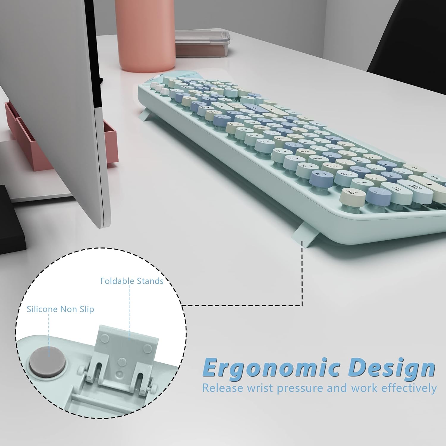 - Retro Round Keys Cute color rounded keycaps with scissor-switch design, silent to press and rebound quickly, bring you visual enjoyment and provide comfortable touch of the fingers, enhance the total smooth typing experience