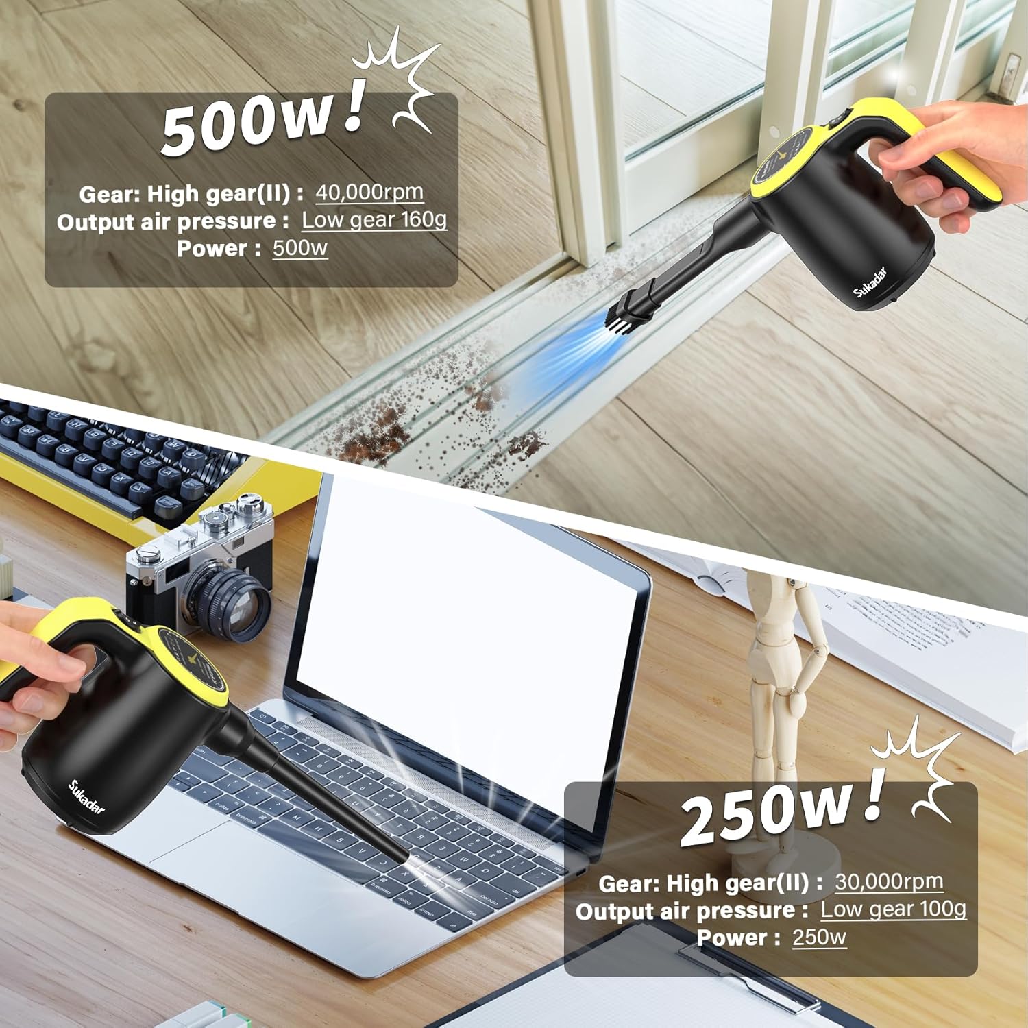 - 500w/250wâš¡: Two Speeds Are Adjustable. The High Speed Gear Can Quickly Clean Stubborn Dust From Electronic Devices And Blow Out Hidden Items Under The Sofa. Bottom Speed Gear Won't Overbearingly Blow Away What Is Needed, Low Noise And Power Consumption.