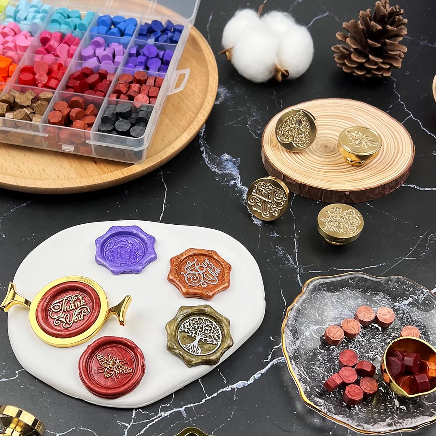 - 【WAX SEAL STAMPS KIT】 672 pcs wax seal beads in 24 colors, 4pcs wax seal stamps, 1pcs wooden hilt, 1pcs stove, 1pcs spoon, 1pcs silicone mat, 10pcs tea candles, 2pcs metallic pens, 5pcs vintage envelopes, 1pcs gift box, 2pcs wax seal mold. This wax seal kit fully meets everything your need in wax sealing process including tools for melting, sealing and decorate wax seals