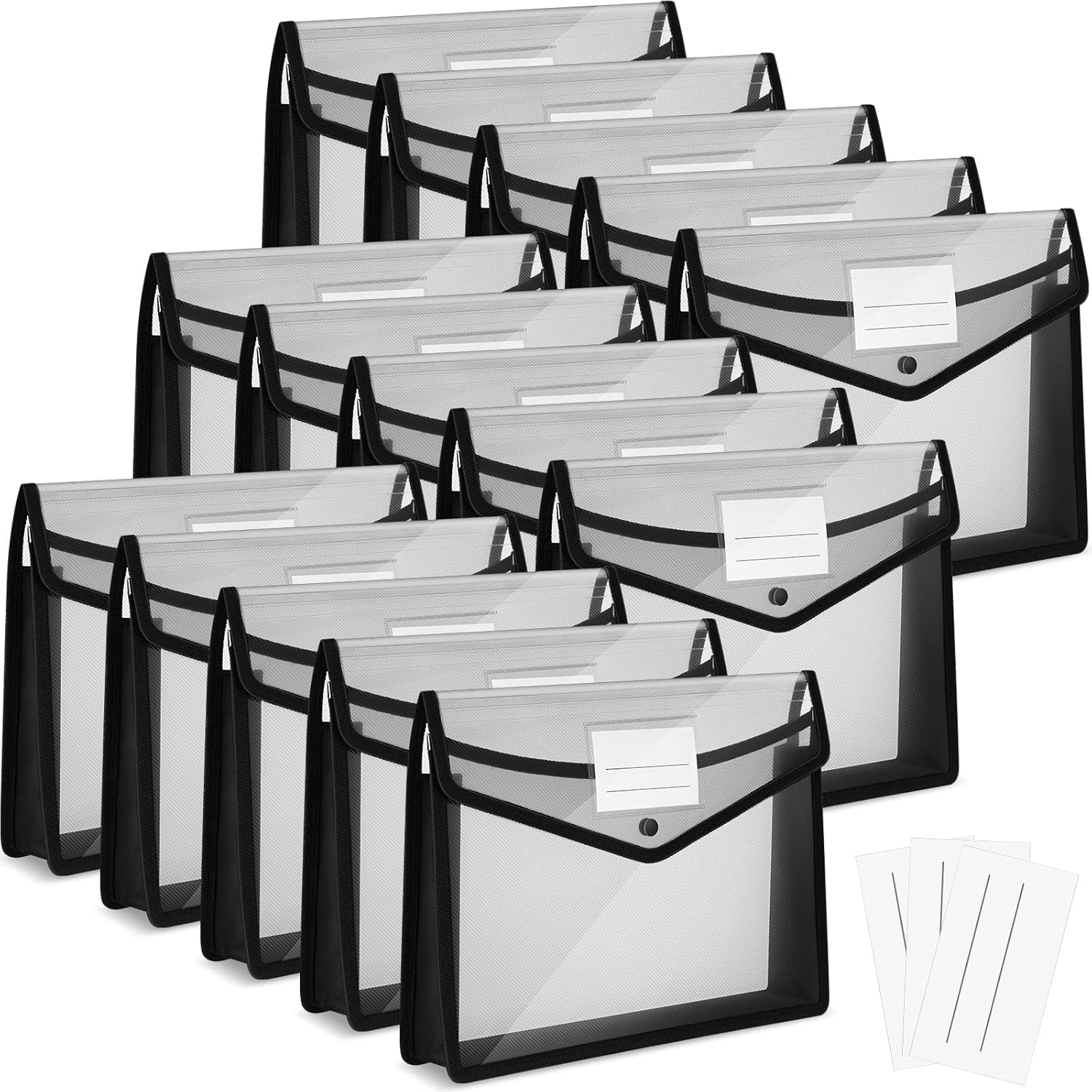 Teling 15 Pieces Plastic File Folders Envelope Expanding File Wallet Document Folder A4 Colorful Document Organizer with Button Closure and Pocket Waterproof File Pouch for Home Work (Black)