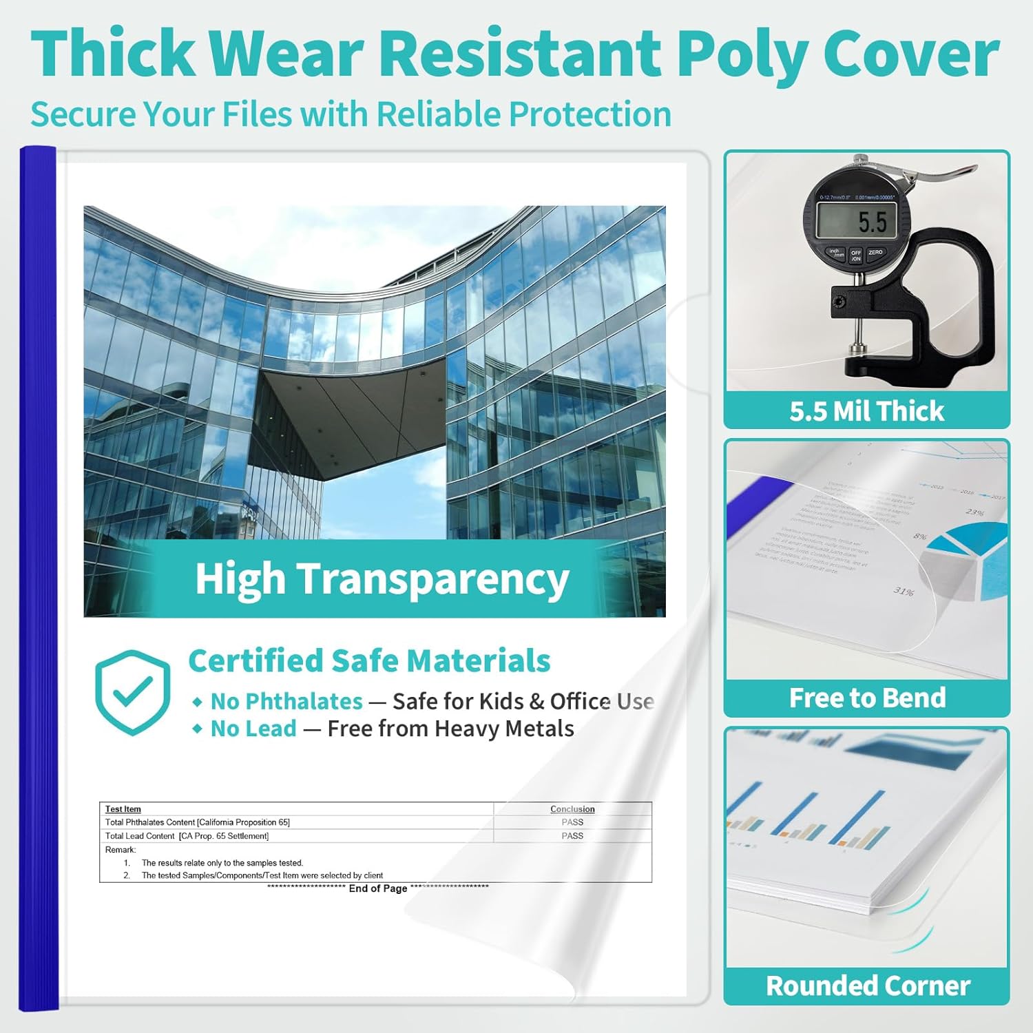 - 【12 Pack for Letter-Size】 This set includes 12 clear report covers and 12 navy sliding bars, designed for standard letter-size paper (8.5 x 11 inches). The transparent front cover enhances the professional appearance, while the secure sliding bar keeps documents neatly in place. UL-certified for quality and reliability, these covers are designed for frequent use and provide dependable document protection.