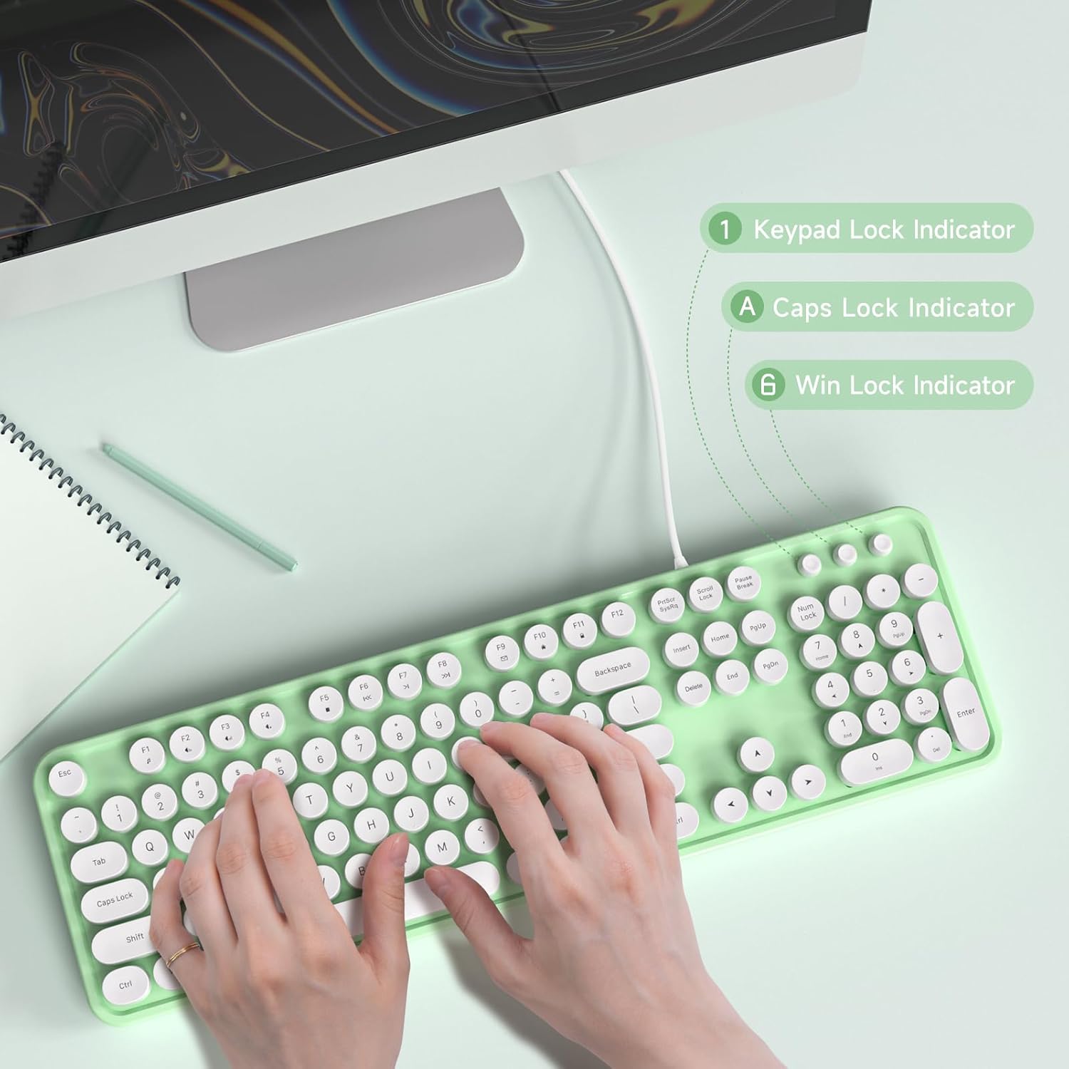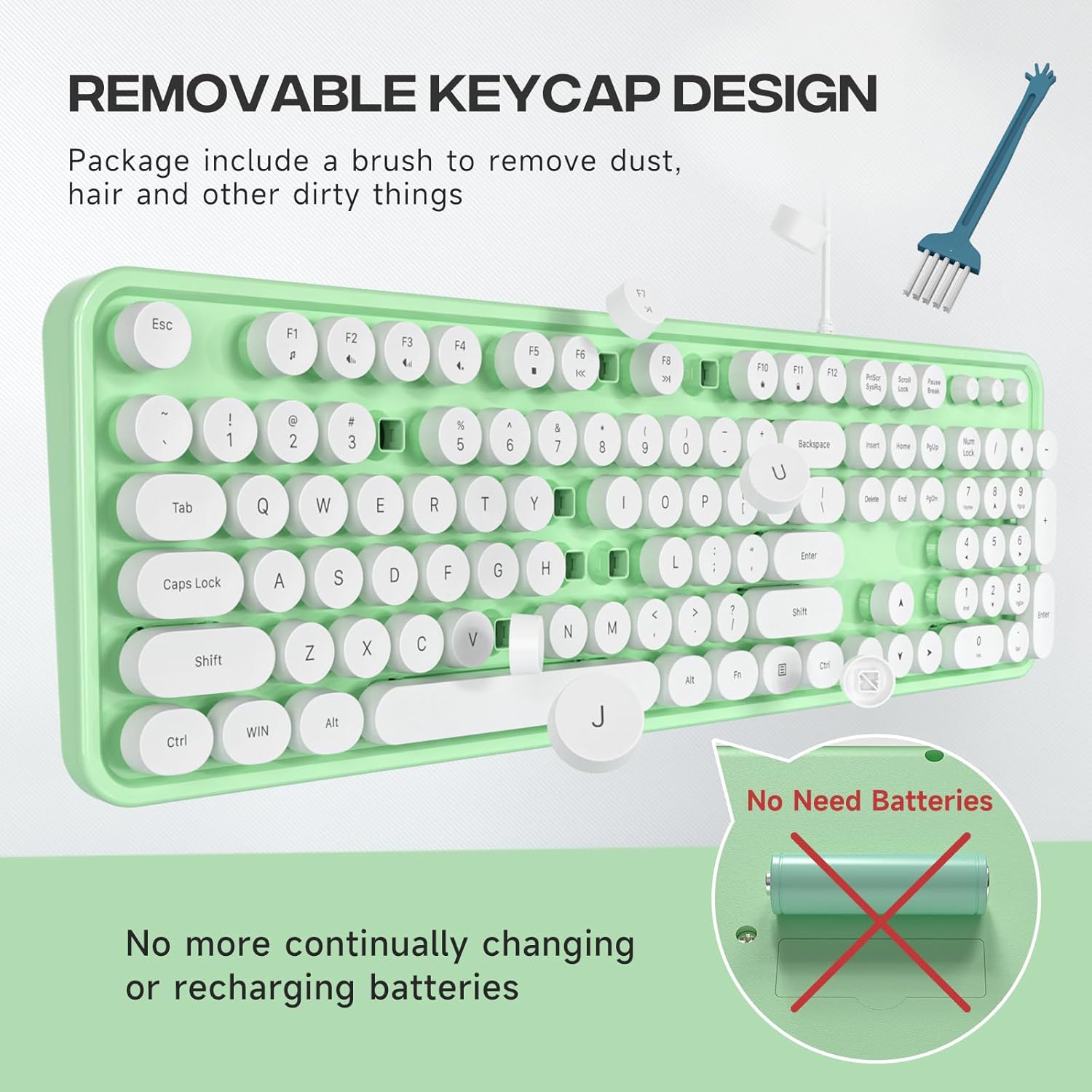 - 【 wired keyboard Keyboard】Cute round keycaps, crisp and sweet sound, perfect knocking feel, let you find the feeling of a retro typewriter. And it’s detachable, making the keyboard easy to clean.