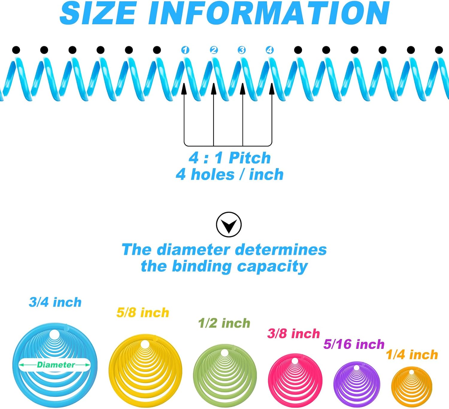 - 4:1 Pitch: spiral binding spines fit letter size paper (8.5 x 11.0 inches), the binding spirals have a 4:1 pitch, will fit any binding machine that punches 4 holes per inch; Helping you combine your report pages, calendars, documents and more, providing much convenience to your daily work or study