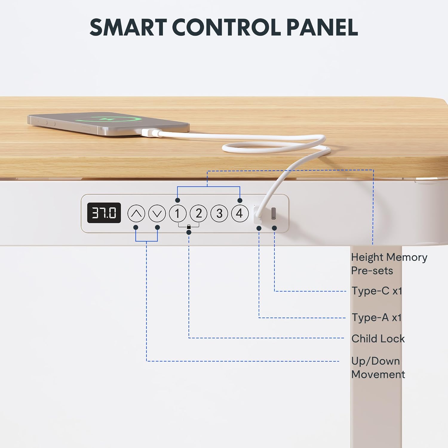 - Embedded Multiple Functions: This standing desk comes with four programmable height presets, making it easy to save your preferred heights. a child lock button helps prevent accidental touch. Charge up to three devices with integrated USB ports without mess & hassle. (Note: USB ports may pause charging while adjusting desk height, Laptop charging is not supported)