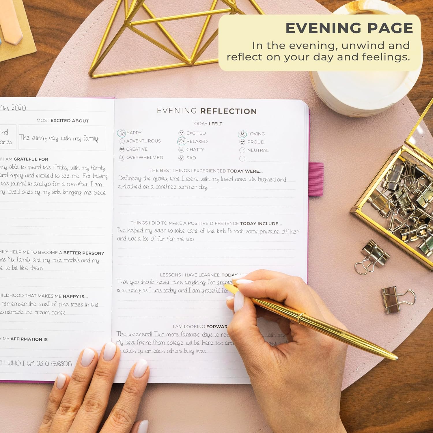 - STIMULATE GROWTH WITH DAILY REFLECTION: Reflect on your day and foster self-awareness with evening reflection pages and regular weekly exercises.