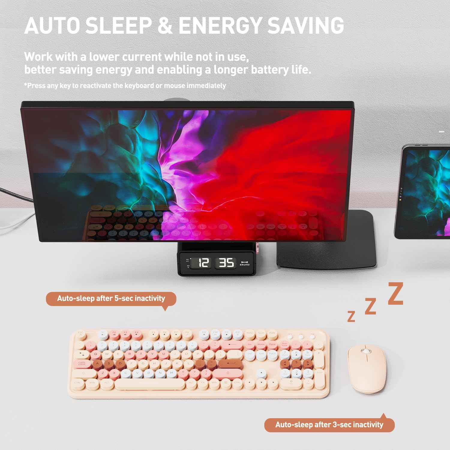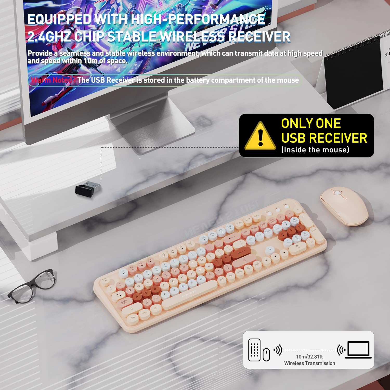 - 【 Wireless Keyboard Mouse Combo】The inspiration for these cute rounded keys comes from vintage typewriters offering you visual enjoyment and a retro feeling to type. With colorful key caps, make you be distinctive in the office and work full of fun.
