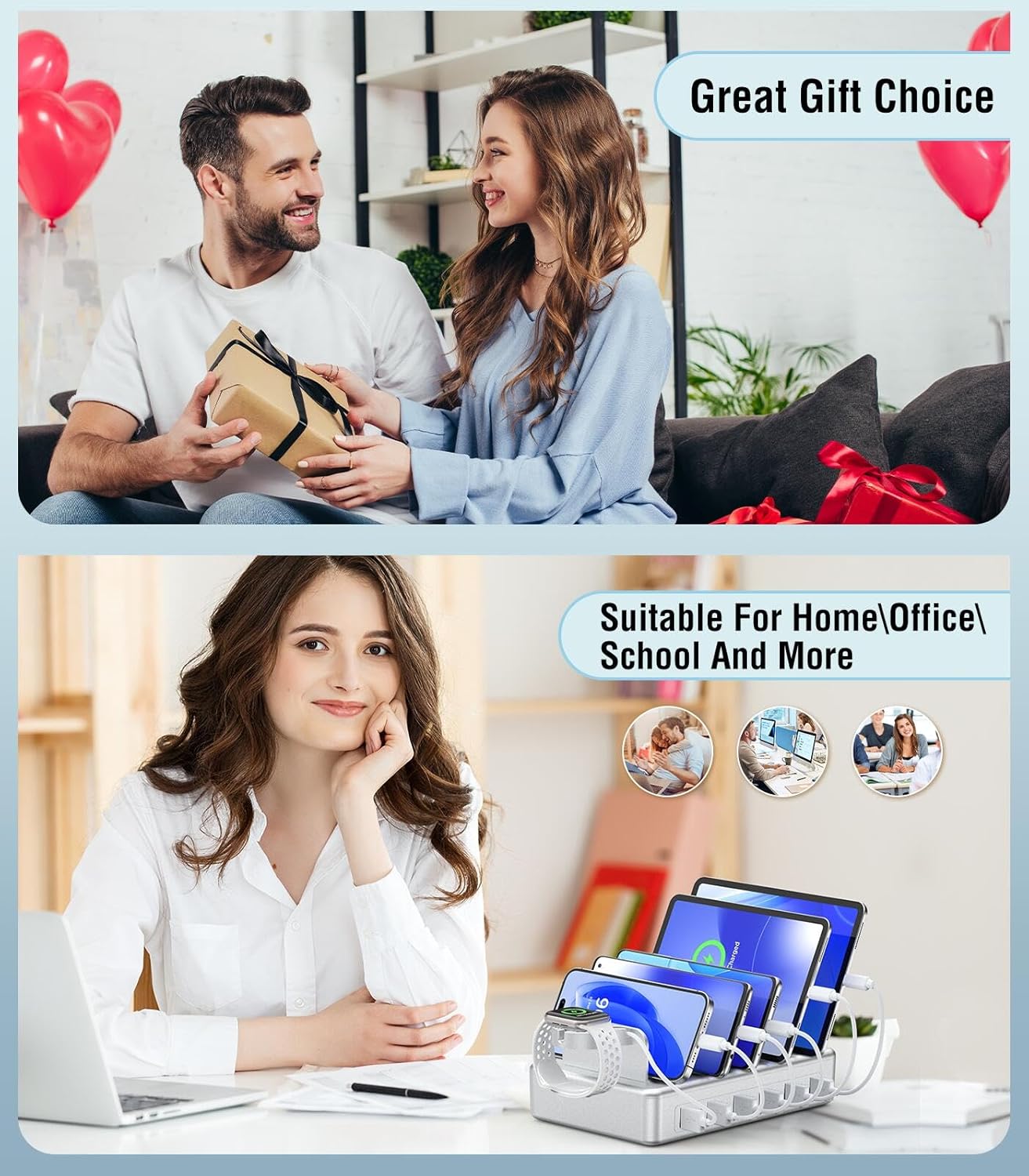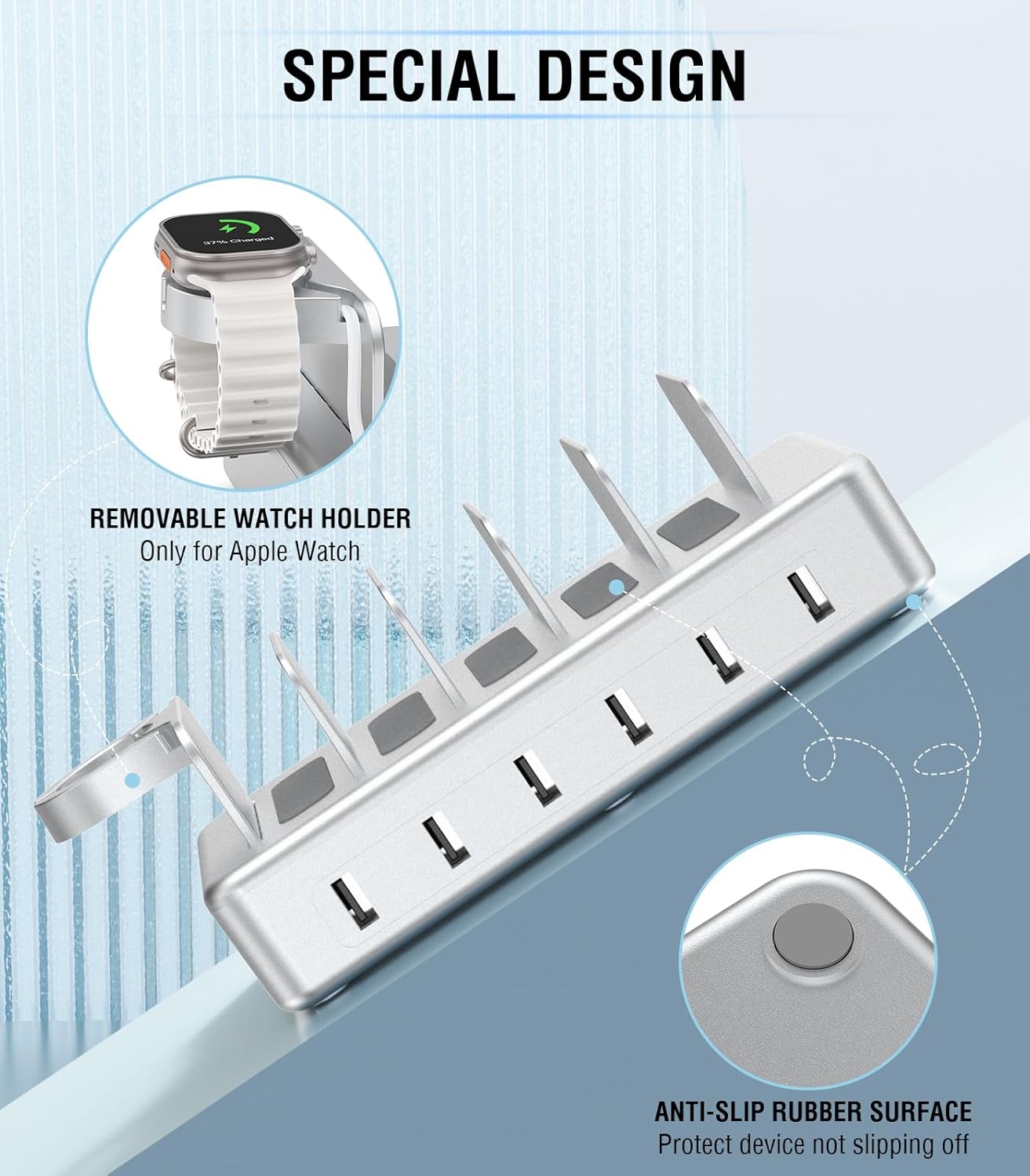 - ă6 IN 1 Multiple Charging StationăThe charger station for apple devices has 6 USB ports that will charge your smartphone,apple watch,iPad,Kindle,and other devices at one time. Keep your devices organized and tidy with this convenient charging station. Besides, every 2.4A port of our multi charger station charges 80% faster than other regular chargers of 1A or less