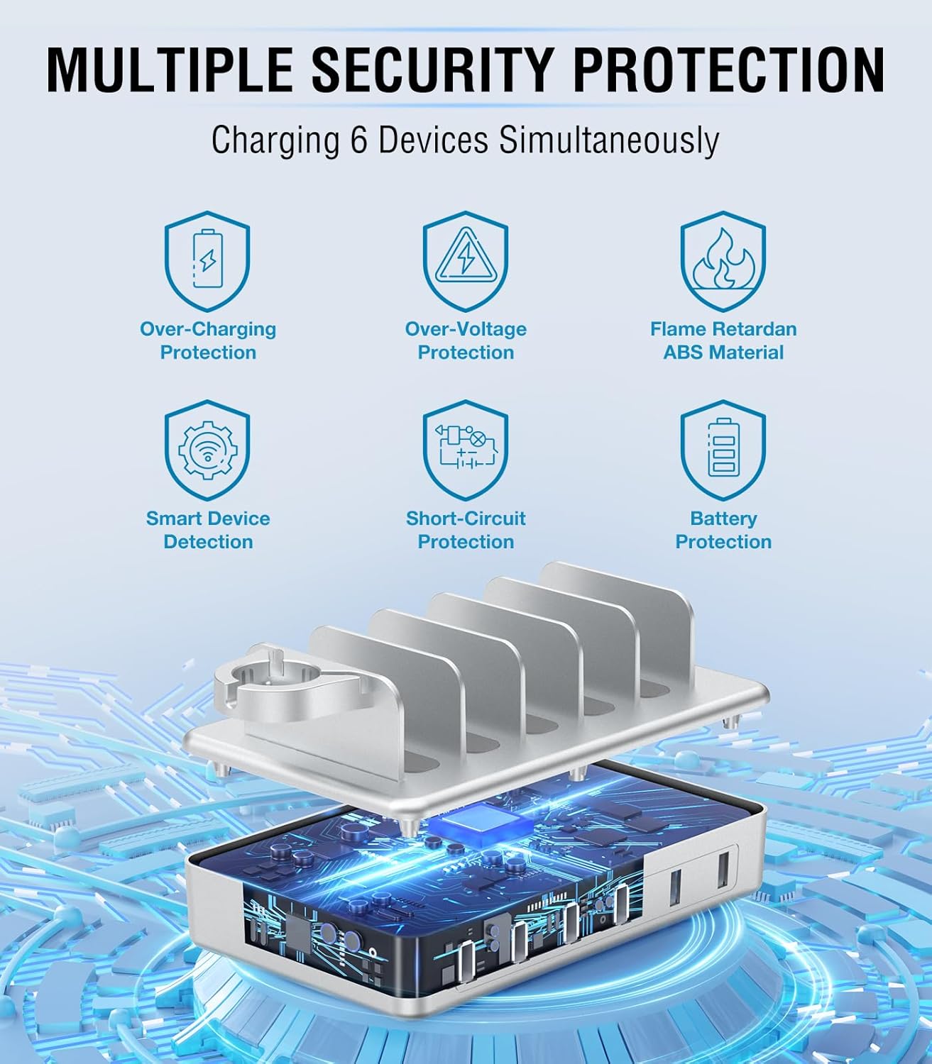 - ăSafety & Multi-Protectionă The multi port charging station utilizes the latest safety systems with multiple protection features. It has short circuits, overheating, and overcharge protection to enable safer and more efficient charging of all your devices. The bottom of the ipad charging station and each slot has a silicone pad to protect devices stable