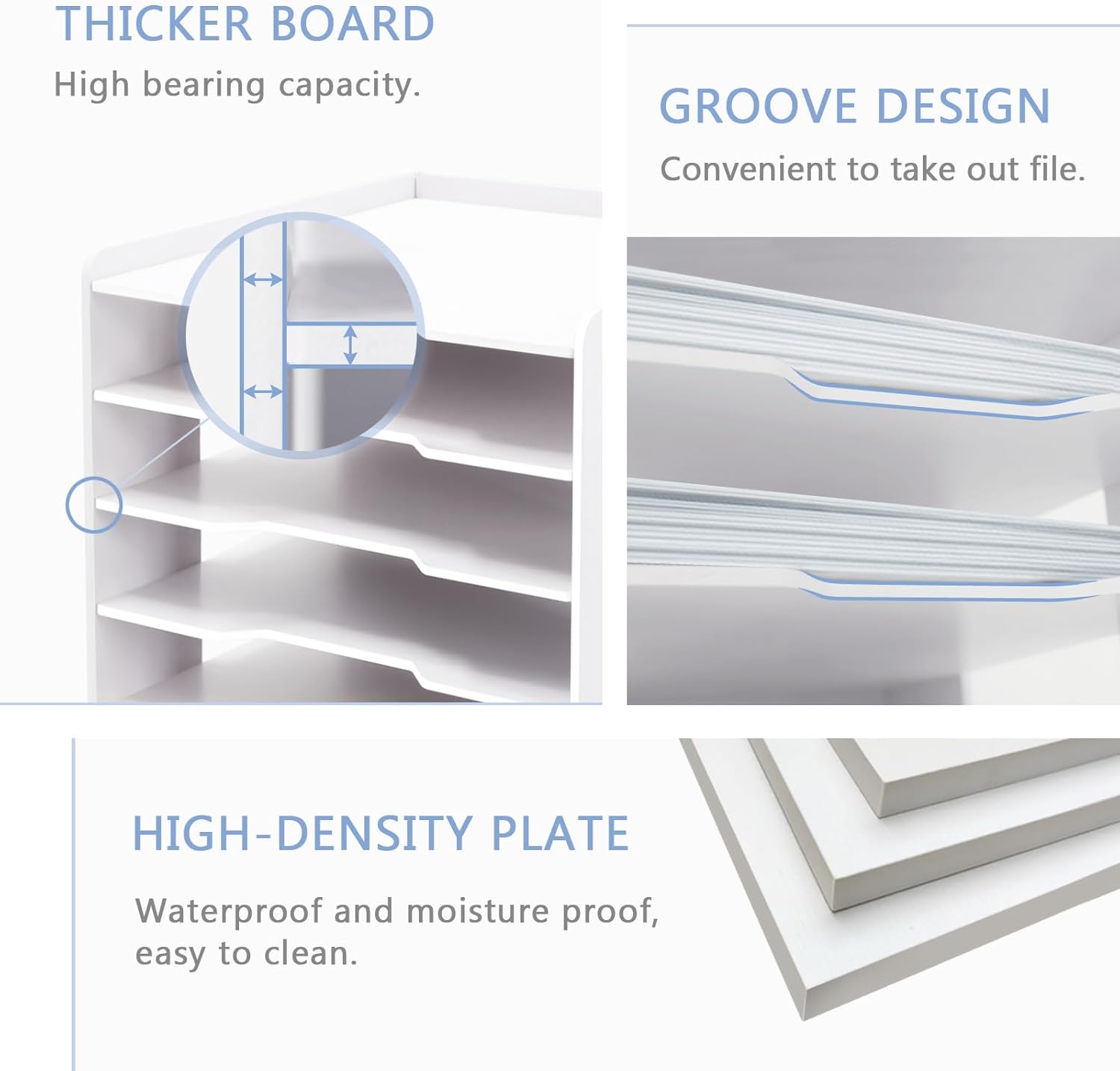 - SUTIABLE DIMENSIONS: The assembled file organizer measures about 12.6L x 12.6W x 15.4H (Inch), each compartment layer high 2.2 inch. The white desk organizer has 7 compartments with extra large size, which were designed for paper measuring 12 x 12 inches. Our desk organizer also fits on a shelf or on the floor. It is perfect for home, office and school