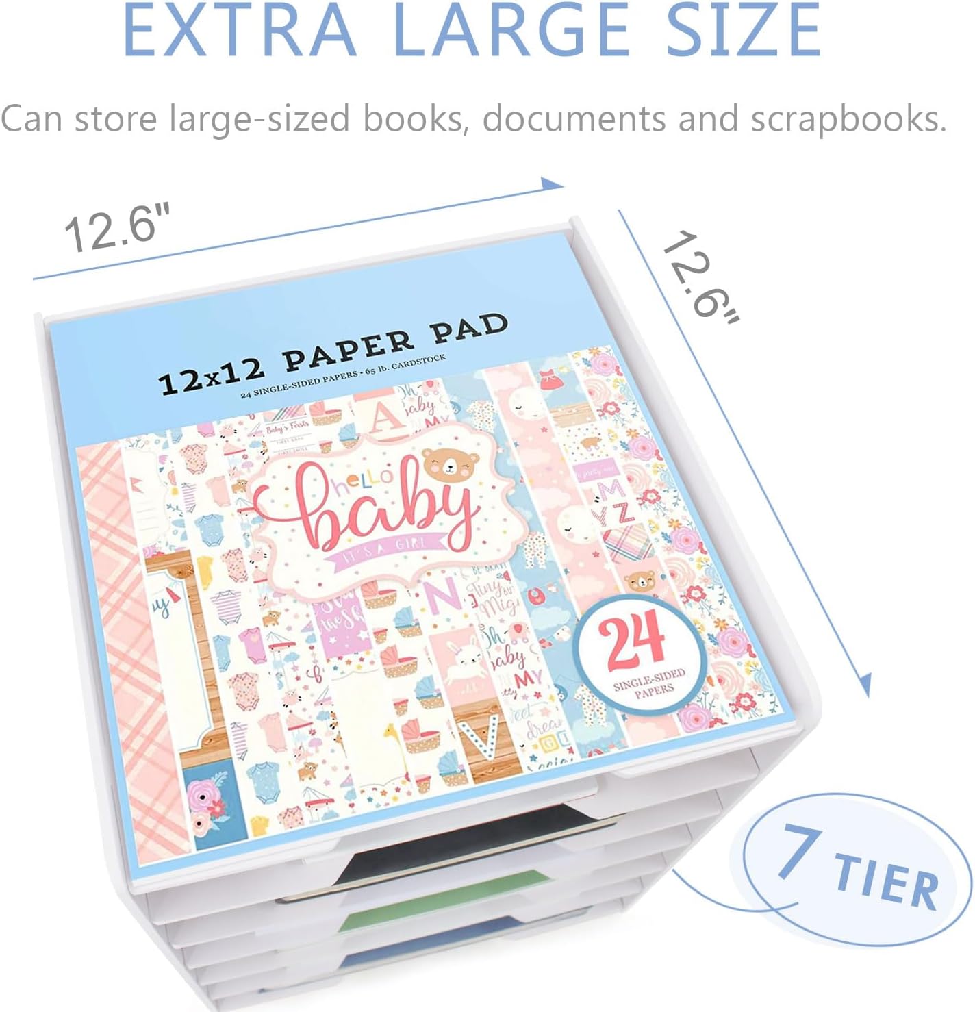 SONGWAY Scrapbook Paper Organizer 12x12-7 Tier File Organizer for Desk, 12x12 Stackable Scrapbook Paper Storage Trays, Desktop File Storage Cube for Home Office School