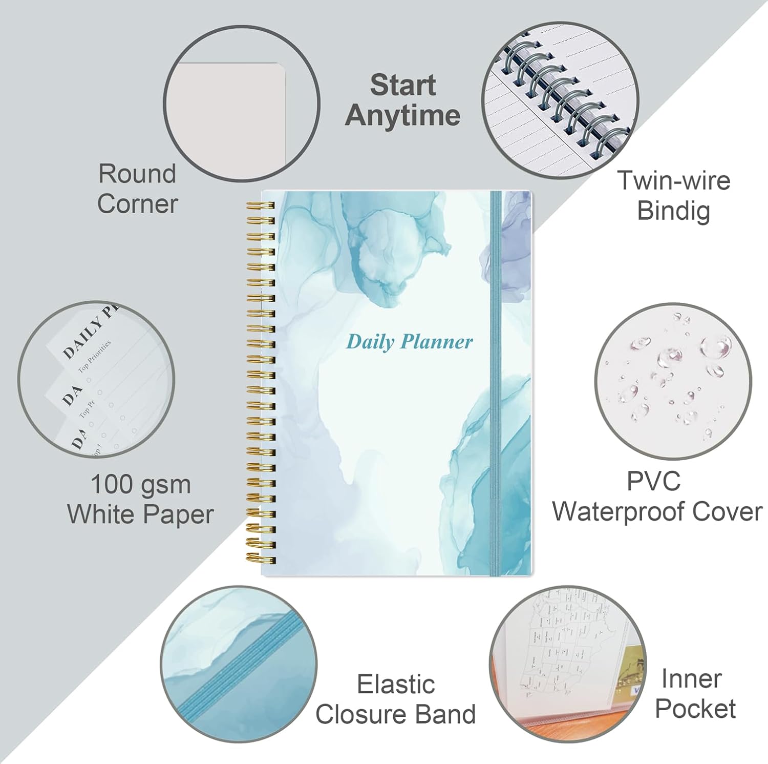 Daily Planner Undated - A5 To Do List Notebook Hourly Schedules, Spiral Appointment Planner for Women and Men, PVC Hardcover, Inner Pocket, Elastic Closure, 5.8" x 8.3", Blue Watercolor