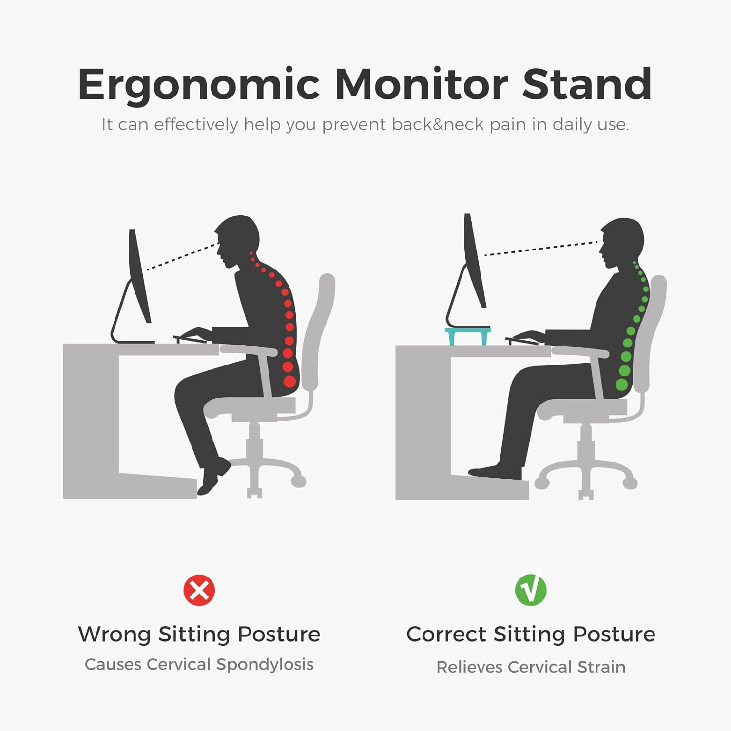 - Relieve Cervical Strain: The Ergonomic monitor riser to help you develop correct sitting habits. Proper sitting posture can effectively help you prevent back & neck pain daily.