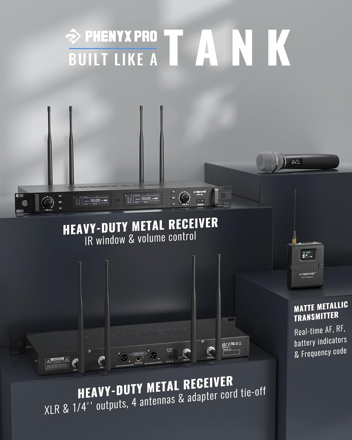 - BOX CONTENTS: 1 x dual-channel wireless metal receiver, 1 x UHF handheld dynamic microphone, 1 x UHF bodypack wireless, 1 x black lapel lavalier microphone, 1 x black headset microphone, 4 x antenna, 1 x 1/4’’ audio cable, 1 x 6.35mm to 3.5mm adapter, 1 x power adapter, 1 x anti-rolling ring, 4 x AA battery for 16hrs long hour use, 1 x user manual