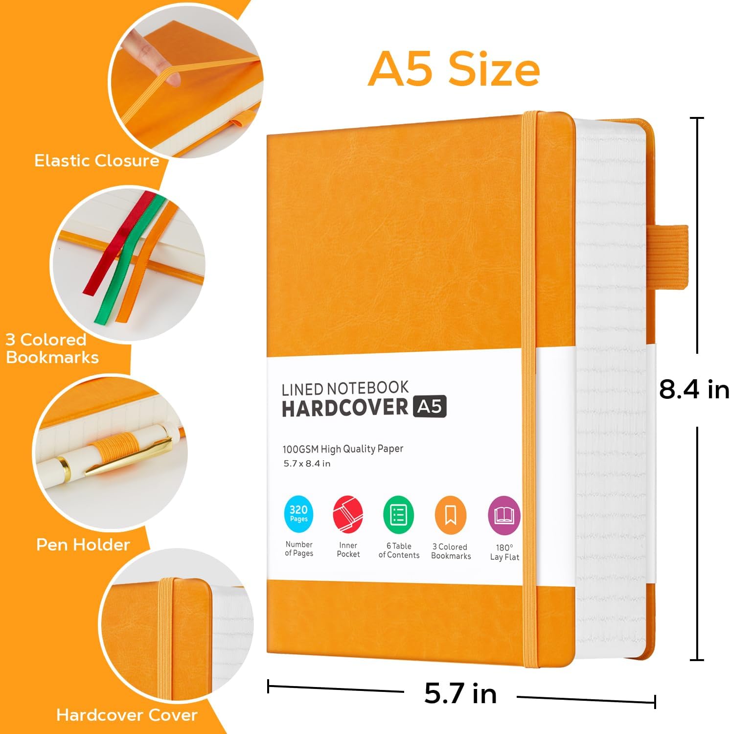 Hardcover Leather Notebooks College Ruled, 320 Pages Notebook Journals for Writing Note Taking Women & Men, A5 (5.7'' X 8.4'') Daily Notebook Journal, Orange
