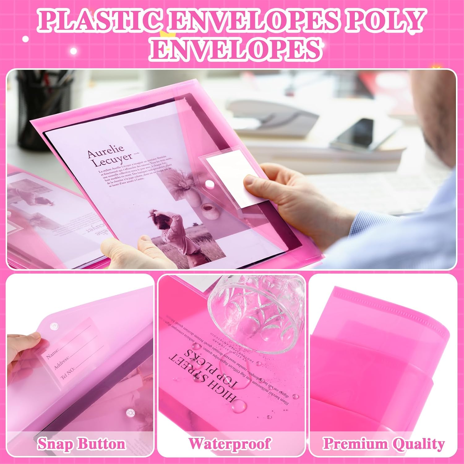 Yeaqee 50 Pcs Plastic Envelopes Poly Envelopes File Folders with Snap Button Closure Clear Folders for Documents US Letter A4 Size Filing Holder with Label Pocket for Home Office School(Pink)
