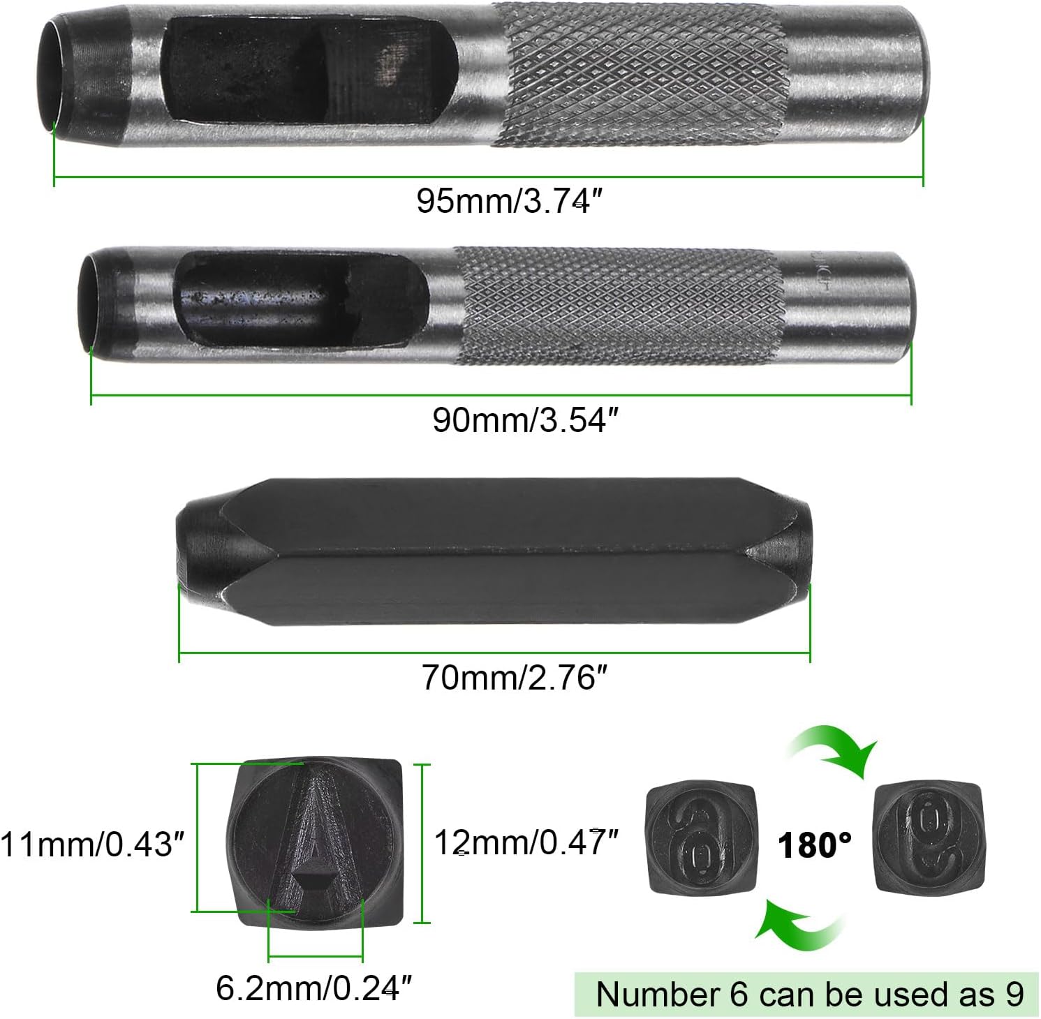 - Metal Stamping Kit - Contains 36pcs of metal punch stamps (26 capital letters from A to Z, numbers from 0 to 8 , an "&" Symbol) sized 25/64" (10mm) of each, and 2 sizes of hole punches.