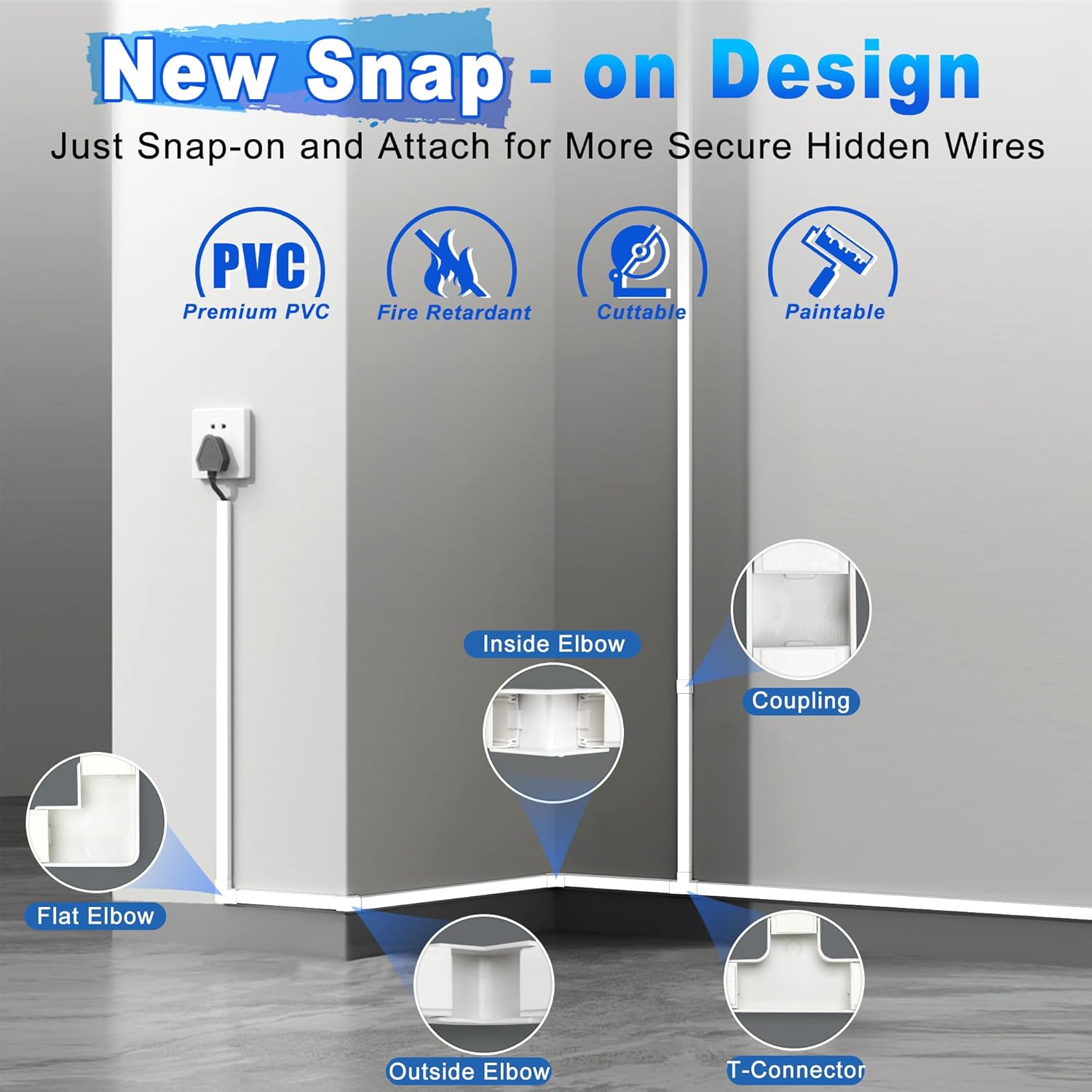 - Superior Quality Cord Covers for Wires on Wall: This wire concealer is made of PVC material and new snap-on fittings for connection. Our cord cover has better sturdiness, durability, and is flame retardant. It hides all your wired devices, eliminates the danger of wires in your life, and provides a safe space for your family and pets.
