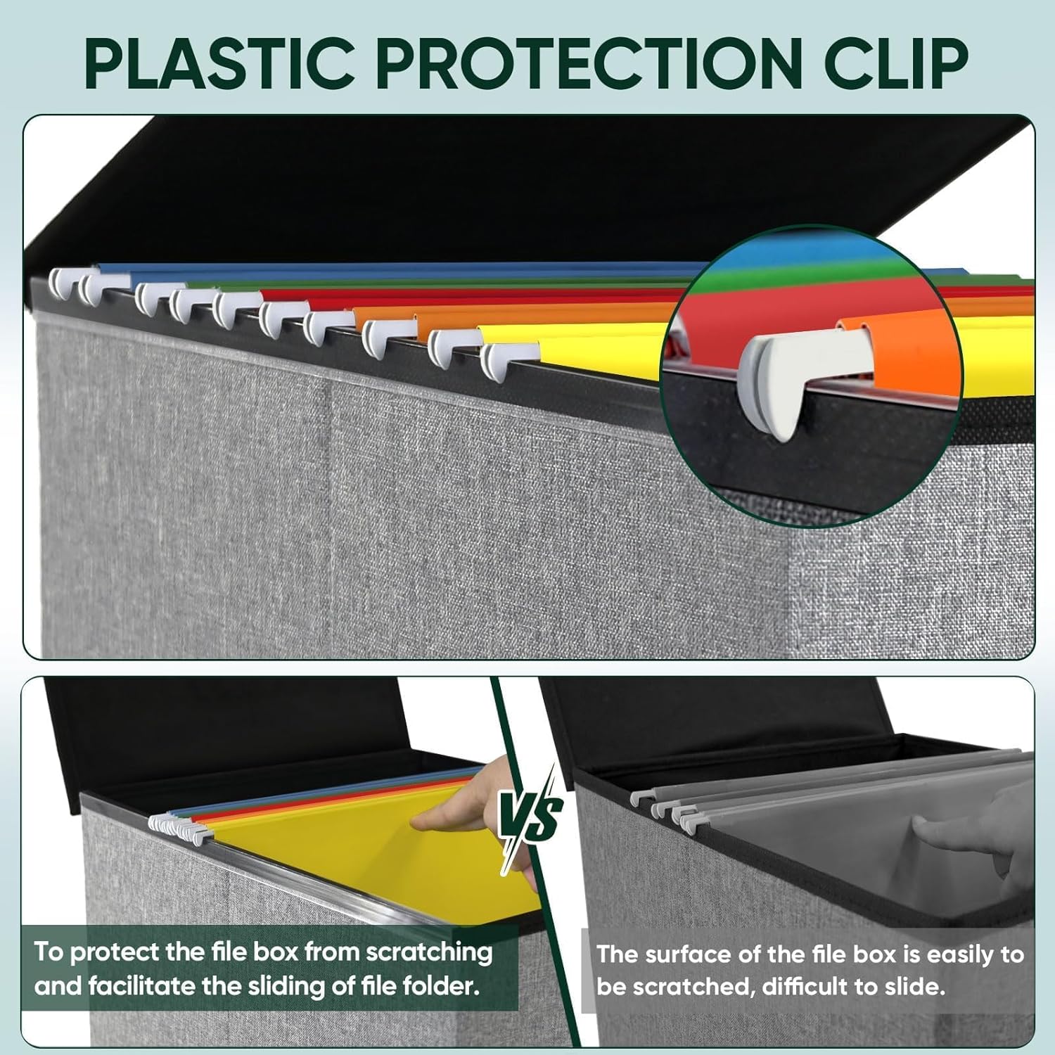 - [UNIVERSAL SIZE] Our file box with lid fits letter-sized files. It is designed for efficiency and functionality, with its smooth PVC slide rails on both sides, you can effortlessly slide file folders for easy access and neatly arranged. The lid fits snugly on the box after hanging folders. (NOTE: file folders are not included)