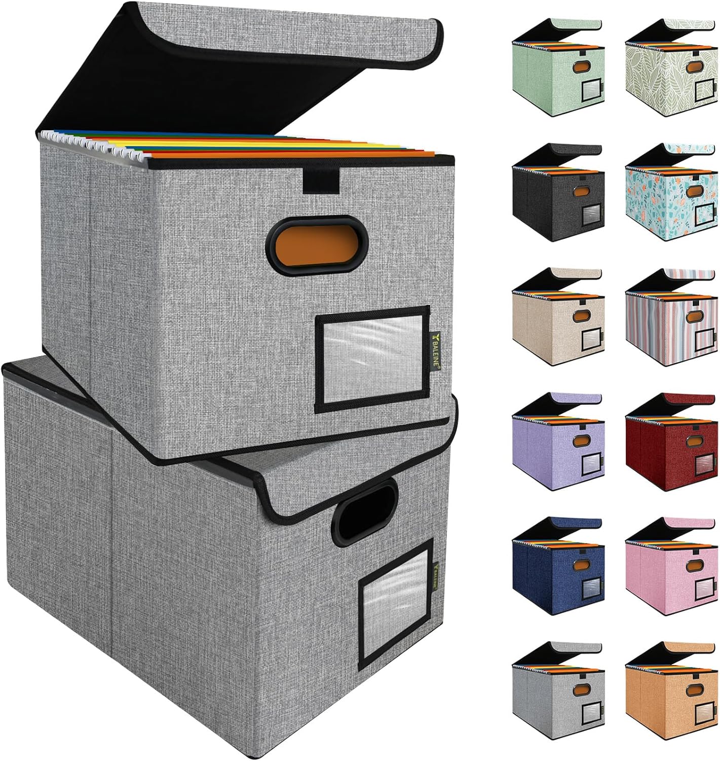 BALEINE File Organizer Box with Lid, Collapsible File Folder Organizer with Plastic Slide, Hanging File Folder Box for Office Document Storage (2 Pack, Grey)