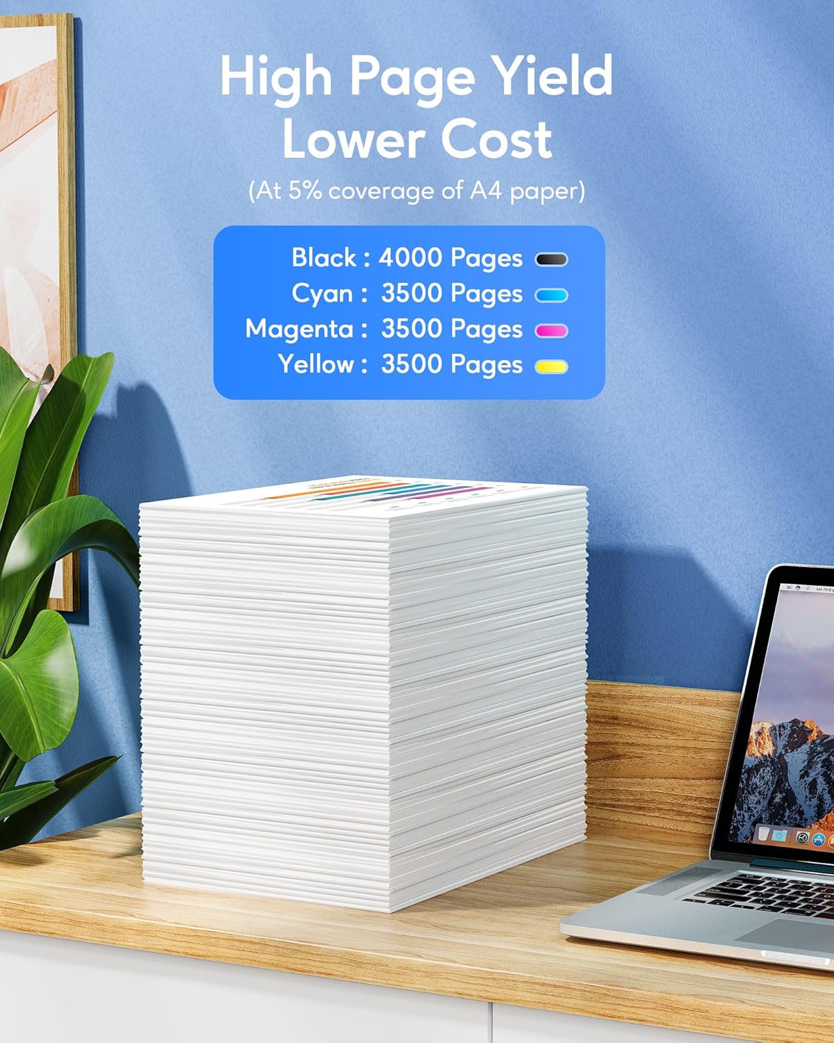- 📃High Page Yield: Up to 4,000 Pages per Black cartridge, 3,500 Pages per Cyan/Yellow/Magenta Cartridge(5% coverage at A4 paper)