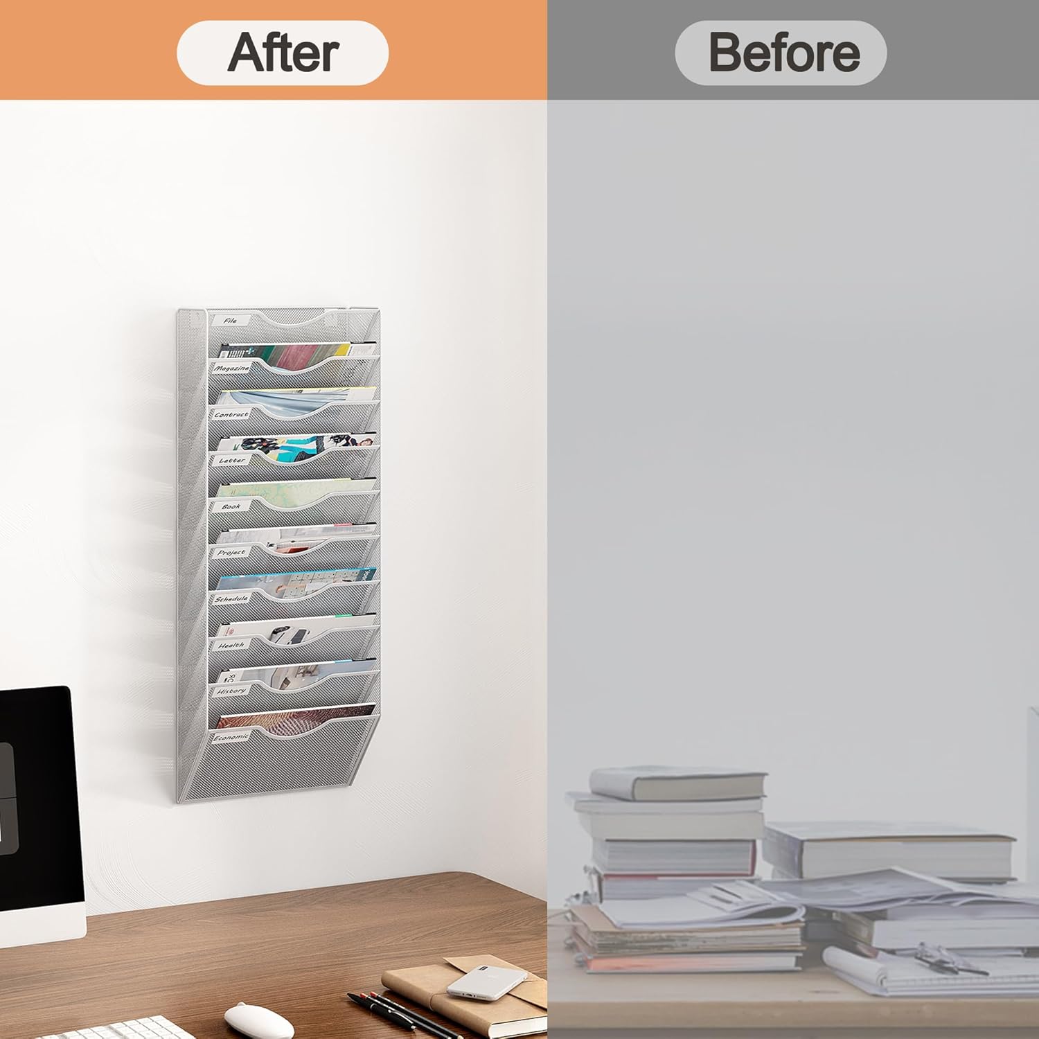 - Durable: The Mail organizer wall mounted is made of durable metal with a coating that extends the life of the wall mount. The metal mesh construction reduces weight while keeping air circulating through the wall paper organizer, so you don't have to worry about mold and mildew on your documents or papers