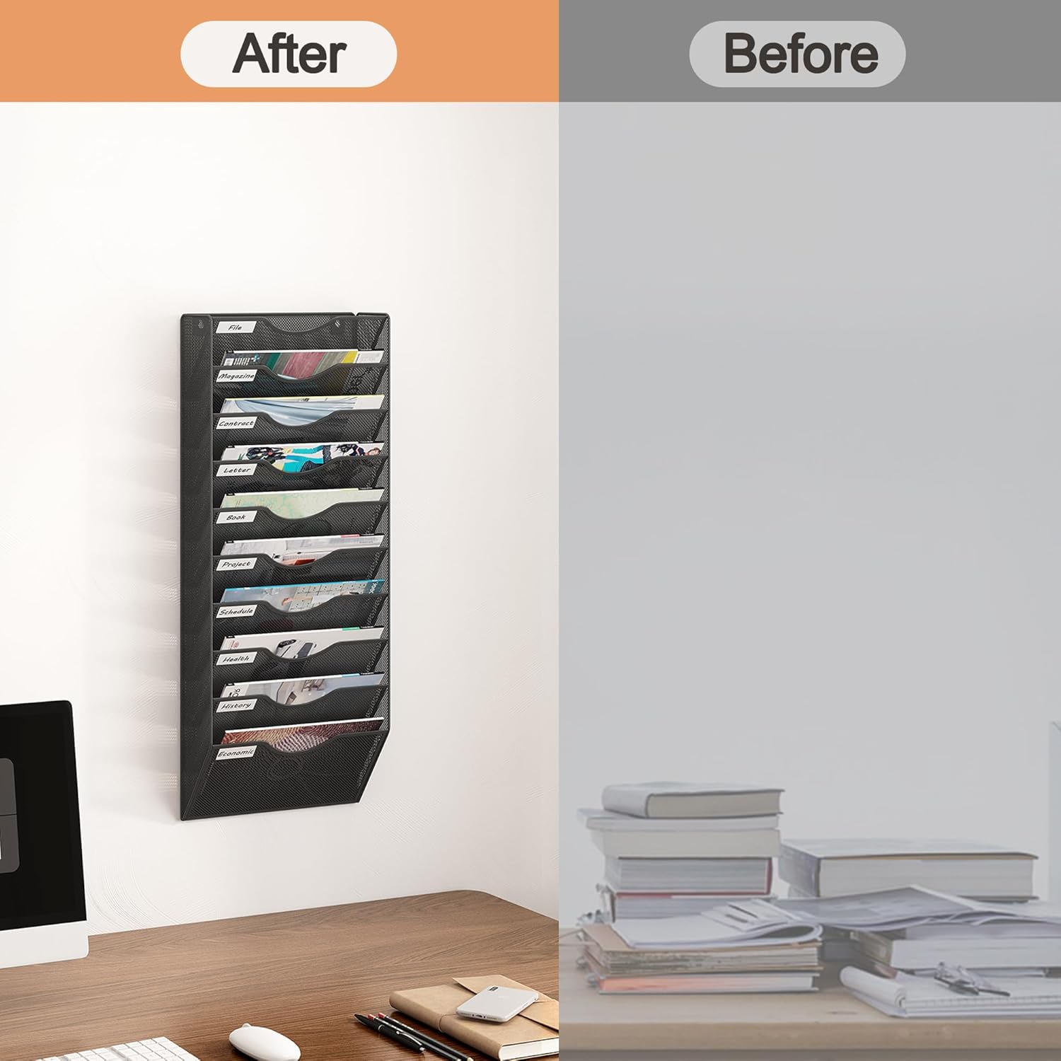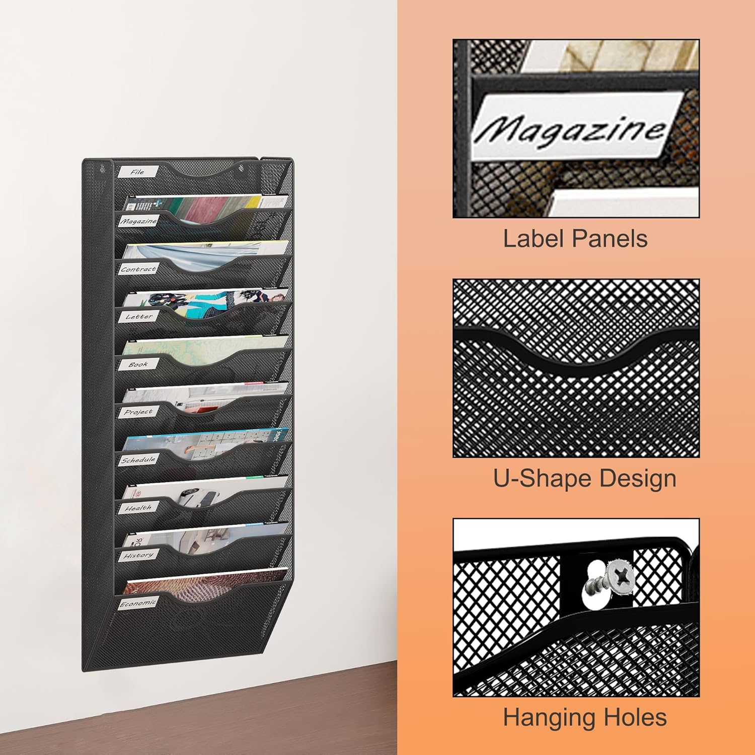 - Thoughtful Design: U-shaped structure allows easy access to desired items from the wall file holder, labeling strips on the edges for quick sorting, smooth edges to ensure that you won't scratch your hands, say goodbye to cluttered desktop and hello to a tidy life