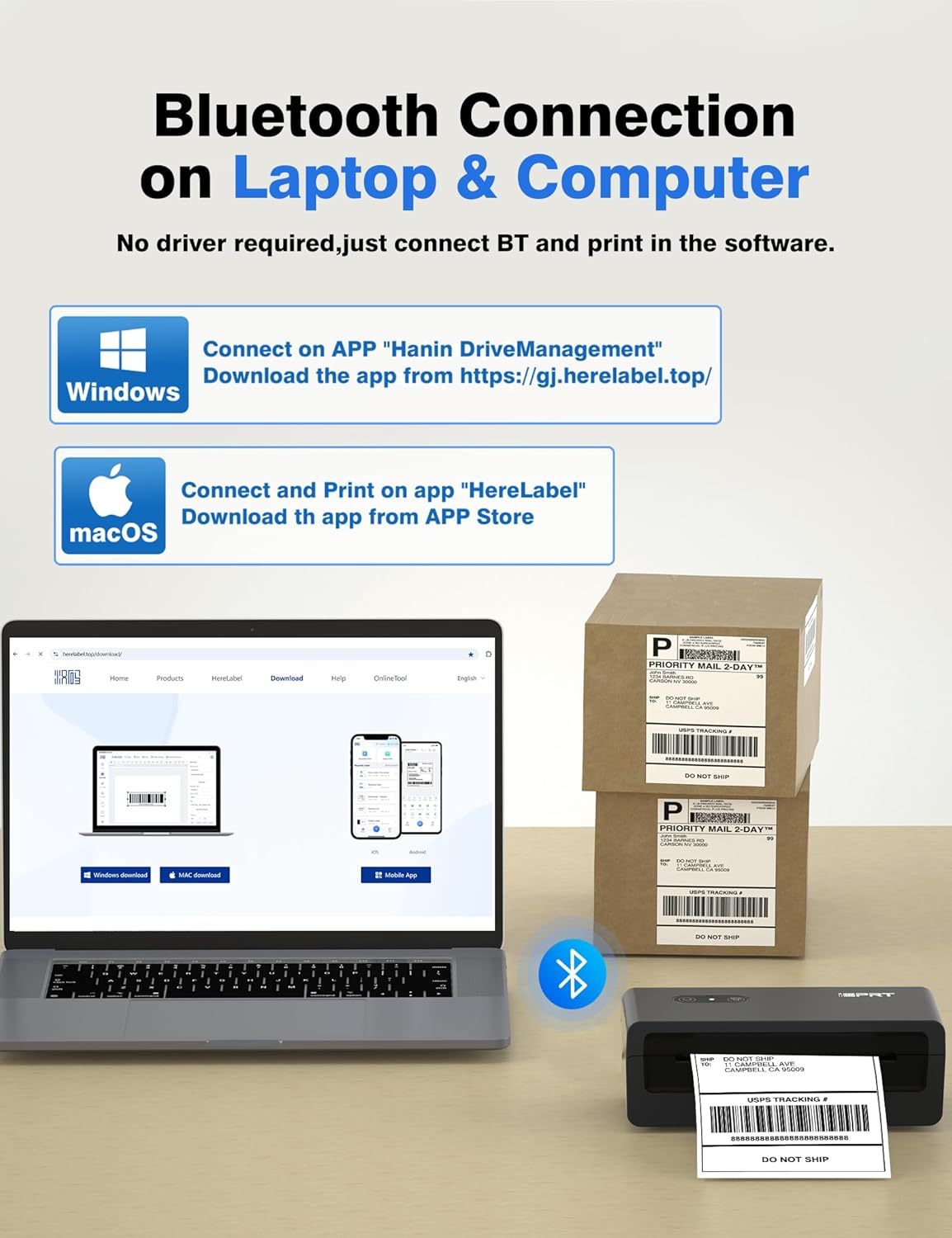 - Shipping Label Printer - Windows / macOS all support Bluetooth connecting via software "Hanin Drive Management" / "HereLabel". (Since we have updated it, please not install the driver from the USB drive). And laptops can also print via USB after install driver.