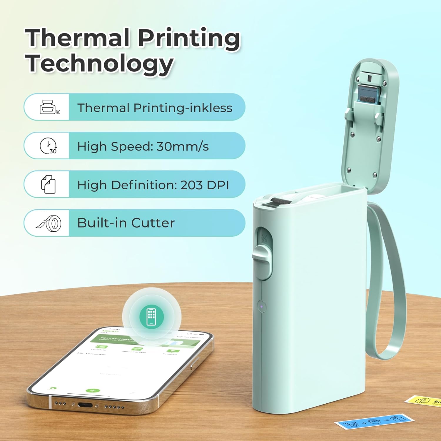 - Multiple Creative Function&Templates: This app of the label maker provides various features and templates, easy to create various design label stickers from App with Text, QR code, Barcode, Materials, Images, Time and Borders, etc. The length of labels is fixed, including 12X40mm, 14X40mm, 14x50mm, 14x75mm, and more. Please do not tear or destruct the green sticker on the back of the label strip , otherwise it will affect the printing effect. (Note: Continuous label tapes are not supported)